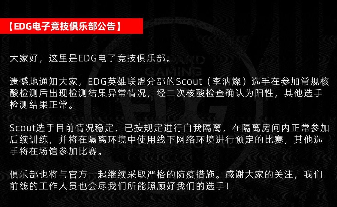 北京时间10月13号清早,EDG官方发布了一则公告,官宣队内中单选手SCOUT,新冠检测呈阳性。公告原文节选如下:Scout(李汭燦)选手在到场休赛日通例核酸检测后出现检测效果非常环境,经二次核酸查抄确以为阳性,其他选手检测效果正常。Scout选手现在环境稳固,已按规定举行自我隔离,在隔离房间内正常到场后续训练,并将在隔离环境中使用线下网络环境举行预定的角逐,其他选手将在场馆到场角逐。 就在EDG官博这则公告发出去不久,好汉同盟赛事官方也更新了一则赛程公告,内容跟EDG这则公告类似。概括来说,内容如下:部门选手新冠检测呈阳性,小组赛角逐次序或将变更。检测效果呈阳性的选手将在单独的房间内参赛,其队友和对方选手将在场馆内参赛。角逐次序大概根据逐日环境发生变革。 根据这两则公告,嫡EDG的第二轮小组赛,SCOUT很大概会在单独的隔离房间角逐,就跟入围赛时间一些角逐类似。角逐次序的调解,应该是参考SCOUT选手的身材病愈状态来定,由于好汉同盟赛事官方特别注明一条:“我们的重要目标,是确保2022环球总决赛的各位选手和工作职员的康健和安全。” 嫡就开始小组赛的第二轮,EDG地点的A组恰好是率先登场的。SCOUT新冠检测呈阳性,对EDG来说不算是一个好消息。现在A组有三支2-1的队伍:EDG,T1和FNC,而现在0-3的C9,仍有理论晋级的机遇。渴望EDG不要由于SCOUT新冠检测呈阳性,而影响战力。固然不能在同一个场馆竞技,只要是沟通顺畅,耽误较低,SCOUT选手当天的身材状态精良,信任EDG还是能取得好效果的。渴望嫡可以等来SCOUT选手的好消息,也渴望在北美参赛的全部LOL战队,留意做好个人防护,平安全安归来。以上就是本篇好汉同盟文章的全部内容,感谢阅读。 |