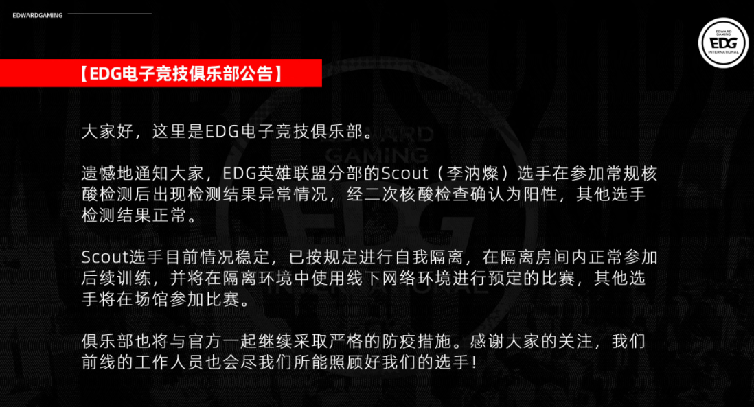 前言:豪杰同盟S12天下赛小组赛首轮已经竣事,而第二轮小组赛之前定于10月14号开张,来自LPL赛区的EDG原来是首位到场第二轮小组赛的LPL战队,然而第二轮小组赛还没有开幕,EDG却突发噩耗,传出了一个坏消息,那就是根据EDG官方公布,SCOUT不幸确诊,这无论对于LPL赛区照旧EDG来说都称得上是坏消息,LPL水友一方面担心SCOUT的康健状态,一方面也担心SCOUT的竞技状态是否会受到影响,毕竟EDG的双C,决定着这支队伍的上限,假如SCOUT状态受到影响,那么EDG第二轮的竞技程度势必会受到负面影响。 EDG状态有所好转,却迎来晴天轰隆信赖关注EDG的小同伴也知道,EDG在小组赛首轮的体现可谓触目惊心,首战就惨败给LCK老牌强队T1,但是随后EDG渐渐找回状态,拿下两连胜,形势开始渐渐好转,不外T1输给FNC,也让A组的形势变得非常复杂。而对于EDG来说,他们在首轮赢下的两局角逐,都是位于蓝色方,而且一抢猫,而如许完善的开局在第二轮很难会复刻。 在一些讲授看来,A组第二轮形势最好的战队是T1,而C9不大概一点大招都没有,第二轮很大概会掀翻其他3支队伍内里的一支,不外EDG的调解本领很强,只要EDG稳稳吃下C9大概,再赢下FNC和T1此中的一支,那么晋级的渴望依然很大。惋惜在众人推测之后,EDG焦点SCOUT确诊的消息却如同晴天轰隆一样寻常出现了。 S12赛程或迎来调解,VIPER压力变大根据官方公布的消息,SCOUT确诊之后S12当日赛程或迎来调解,选手假如能到场角逐,那么将在一个隔离环境中长途参赛,而其他选手线下参赛,客观来说,这肯定会影响到EDG的角逐状态,起首SCOUT肯定状态会欠好,其次会影响到EDG的队内沟通,毕竟线上交换肯定没有线下交换更顺畅。 其次之前也说过,EDG是个主打双C的队伍,假如SCOUT状态不佳,那么无疑是雪上加霜,VIPER的压力无疑会更大,而对手也肯定会重点针对中路大概下路,让EDG的战术摆设变得更加困难。别的有水友扒出了SCOUT的RANK战绩数据,发现他已经两天没有打RANK了,大概也能反映出他如今的状态是真的欠好,这无疑又让不少EDG铁粉担心起来,假如SCOUT无法到场角逐,那么EDG不大概短时间内提上来一个替补来顶替他,而且取得不错的结果。 个人分析总结EDG传出坏消息,之前各人最担心的变乱照旧发生了,EDG受加入外因素影响,从选手到锻练组的压力肯定会大幅提升。不外自从MSI以来,LPL在应对突发环境也越来越有履历,而EDG又是一支专业化非常强的俱乐部,以是LPL水友和EDG粉丝也不至于过分灰心。固然在一些铁粉看来,出现如许的环境EDG只是须要努力就好,即便小组出局也不会有太多怨言。而EDG的突发状态对于其他LPL战队来说也算是敲响了一个警钟,那就是要更加严格地做好安全防护,从而克制不测环境的发生。那么末了题目来了,各人以为EDG颠末这个突发变乱后,是否还能稳住心态和状态,顺遂冲进8强? |