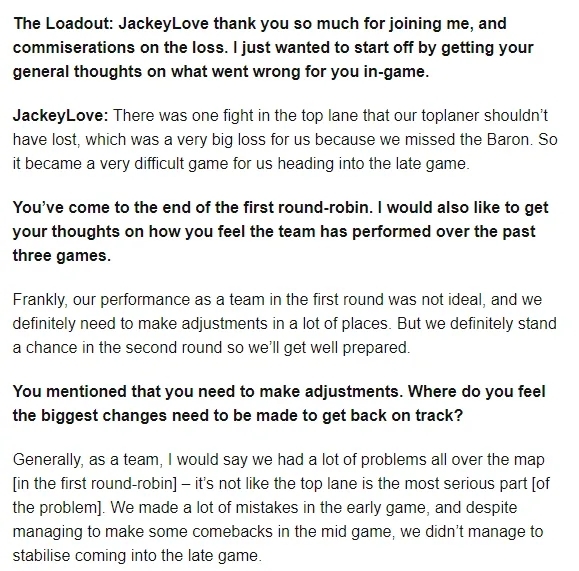 JKL:上路那波团战我们上单不应该迷路的。这波团的败北对我们影响很大,由于我们为此丢掉了大龙。以是这导致我们到游戏后期打得很困难。 本日,外媒The Loadout发表了对TES下路选手JKL的采访,此中JKL偏重提到了上路的那波团战。确实云云,上路那波团战对于TES的影响着实是太大了,起首在对面大树TP的时间,Wayward没有第一时间TP下来,导致TES是3打4,假如当时Wayward能第一时间TP下来,多个前排,效果大概完全就不一样了。其次明知对面在打大龙的时间,假如Wayward能从上面绕到龙坑牵涉,大概JKL就不会吃那么多伤害,就尚有利用的空间,但是Wayward却绕了一大圈,还点果子进龙坑,然后又跳上来,不光白白浪费了自己的E技能,还错过了最佳机遇。 实在整个小组赛中,Wayward的表现都非常糟糕,纵然是面临越南队GAM的那一场,Warwad也是毫无存在感,不外是由于队友上风太大了,以是各人才没有过多地在意。而在与RGE的角逐中,Wayward不光对线没打过,而且是敢抓就敢死,团战也是经常迷路,贻误战机。看来Wayward还是太年轻了,扛不住压力啊。 |