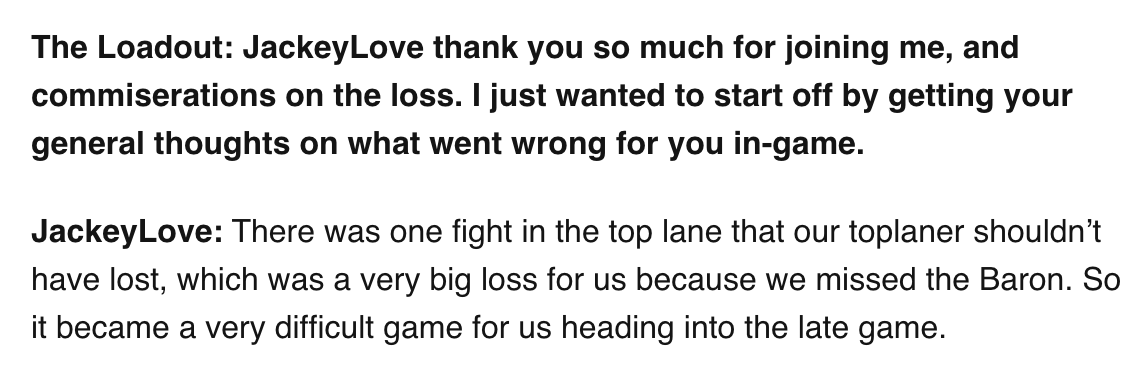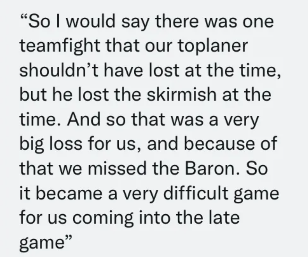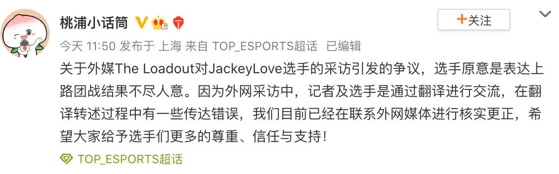 近来关于Jackeylove在继续外媒采访时提到上路那波团败北导致大龙丢掉的采访,引发了许多人的讨论,有人求全谴责Jackeylove将锅丢给了上单,也有人表现是采访翻译堕落导致的。 那么究竟原形是什么呢? 我们先来看下原文里是怎么写的 JackeyLove: There was one fight in the top lane that our toplaner shouldn’t have lost, which was a very big loss for us because we missed the Baron. So it became a very difficult game for us heading into the late game. 原文中出现了两个关于上路的词语,一个top lane,别的一个是toplaner,由于我常常翻译国外的一些采访,以是对于这两个词还是很敏感的,起首top lane指的是“上蹊径”,在原文里实在就是指上路那条线发生的一场团战,而toplaner,一样寻常泛指上路的选手,在好汉同盟里,特指的就是上单选手,以是这里这段话的意思就是“上路那波团,我们的上单不应该输掉的” 这段的翻译无论是放在谷歌还是bing,亦大概是人工翻译,大要的意思是没差的。 之后有网友就此向外媒Loadout采访的记者扣问,这段话有没有翻译错误,而得到的回应是:没错! 但是就在刚刚,TES的超话主持人就此事举行了回应,他表现“选手原意是表达上路团战结果不尽人意”,是在翻译转译的过程中产生了歧义导致的。 那么事变就故意思了,究竟Jackeylove说的是上单还是上路呢? 实在我个人更方向上路这个说法,为什么呢? 每年的天下赛,官方的翻译团队实在都黑白常紧缺人手的,许多外语翻译都是通过一对一转译,以致是一对多转译举行采访的,好比采访的记者是个葡萄牙语和英文双修的,但是翻译又只会中英双语,那么这期间就必要将采访的内容举行三语之间的轮换才行。采访过程中,某些词语就会由于些许的明白错误而产生庞大的歧义。 而这段采访里,堕落的就是这个“Toplaner”,固然之前我们说了,是特指上单,但这里显然本意是上路的选手,这两者的区别还是很大的。 以是这件事里,Jackeylove的本意大概率是上路的那波团,上路的选手输了导致大龙丢了,结果翻译一看到“上路的选手”,直接就翻译成了Toplaner(上单选手),但实在Jackeylove这里的【上路选手】指的是其时在上路打团的选手,由于当你回看与RGE那场角逐时,那波最关键的上路团,wayward是反面TP才到场的,而一开始到场团战的是TES的中野辅,Mark在草丛找到了对面的辅助洛,先手开团,结果RGE众人支援非常快,Knight将洛推走后自己和tian被击杀,导致后续大龙丢了。 以是厥后我们看了翻译然后再回看角逐就感觉对不上这段话,根本的缘故原由就是这里产生了一种明白上的歧义,将Toplaner翻译成了上单选手,而不是Jackeylove所表达的“上路的选手”。 后续该网站的记者也表现,没想到这个采访会产生这么大的误解。 末了就是Jackeylove在中午的时间刚刚更新的回应: “自己可以拿职业生存包管没有甩锅队友,扣帽子的爬远点。” 以是这波谁的锅呢? noting! |
