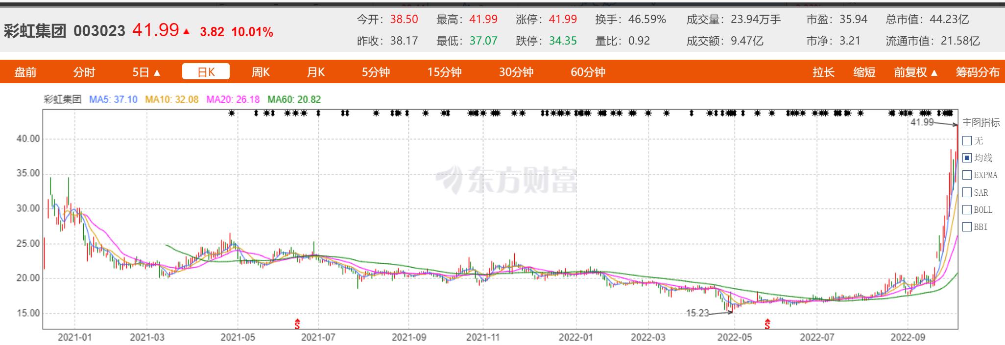 新京报讯(记者郑明珠)10月13日,彩虹团体再次涨停,近12个一连生意业务日劳绩8个涨停,累计涨113.15%。制止10月13日收盘,彩虹团体每股股价为41.99元,创上市以来新高,总市值为44.23亿元。 彩虹团体股价走势。东方产业网截图 彩虹团体主业务务包罗电热毯、电热暖手器等系列家用柔性取暖和用具以及电热蚊香液、电热蚊香片、盘式蚊香、杀虫气雾剂等系列家用卫生杀虫用品。 9月23日、9月29日和10月10日,彩虹团体三次发布股票生意业务非常颠簸公告。在9月23日彩虹团体披露的《股票生意业务非常颠簸公告》中表现,公司组建了外洋市场开发部分和服务团队,从事产物出口业务,且本年取得了一些电热毯出口订单,单张订单数量低,总体金额小,未对公司收入产生实质影响。 10月10日,彩虹团体收到厚交所关注函,要求其阐明近两年业务收入、国表里贩卖收入、业务根本面是否发生巨大变革等,近期股价涨幅是否与根本面相匹配,是否与偕行业上市公司变动幅度同等,并结条约行业上市公司估值、市盈率、股价变动等情况,就短期内股价涨幅较放肆行充实风险提示。厚交所还要求彩虹团体联合公司策划情况、在手订单情况等,增补阐明公司电热毯等家用柔性取暖和用具相干产物在国表里已实现的贩卖收入、占公司总业务收入的比例。 编辑 王琳 校对 卢茜 |