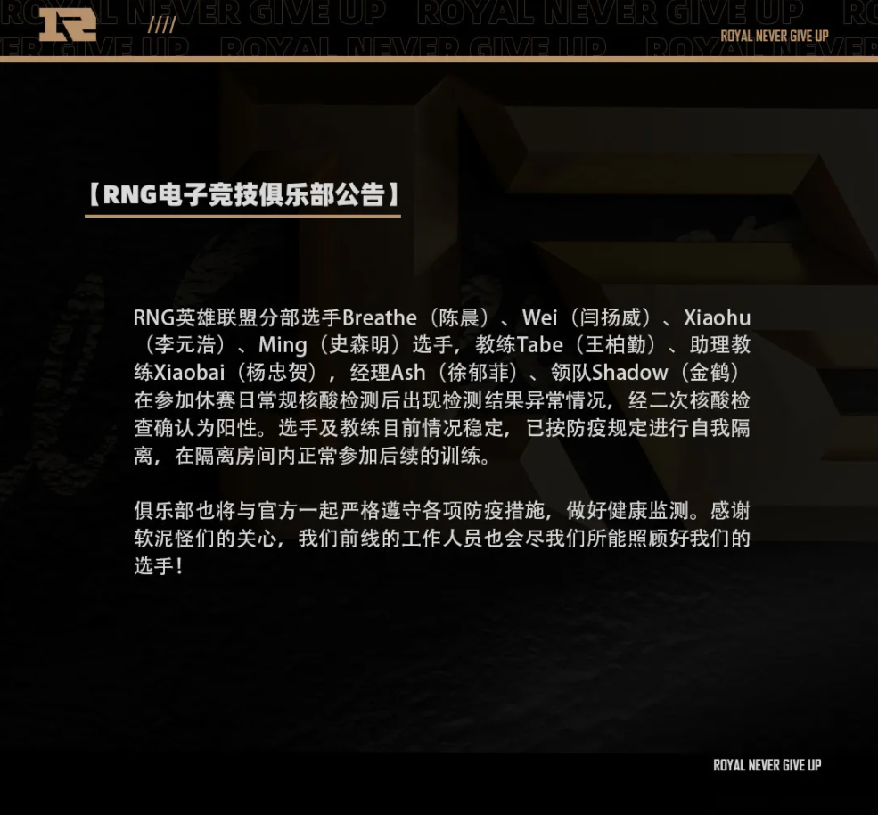 好汉同盟S12火热举行中,腾讯消息将为您带来一手赛资讯,为您出现全方位的电竞盛宴。 S12天下赛小组赛第一轮的比赛竣过后,就陆连续续有战队发布选手和锻练确诊的消息,不久前LPL赛区这边,EDG官宣了中单Scout确诊,其他选手和工作职员现在检测正常的消息,引发了不少粉丝的担心。但是没想到在小组赛第二轮开赛的当天,RNG传出了更坏的消息,全队除gala之外,其他人全部确诊。 RNG发布的官宣消息如下,表现上单Breathe、打野wei、中单小虎、辅助Ming,以及锻练、助教、司理和领队全部确诊,不外幸亏选手和锻练现在情况都很稳固,已经开始隔离,将在隔离中到场训练。 也就是说现在只有Gala、朱开和替补辅助的检测效果是正常的,很大概会出现RNG在小组赛第二轮比赛的时间,只有Gala一人在现场打比赛,其他人都在隔离房间中参战的情况。像EDG就是中单Scout确诊后,他一个人在隔离方面打比赛。这对于Gala如许一个社恐的选手来说,大概是很大的查验了,不外RNG的比赛尚有几天,假如其他选手和锻练测试效果转阴,就像是之前入围赛的FNC那样,那对于RNG的影响还不大。 根据RNG官方的消息,现在确诊的选手和锻练们情况都比力稳固,可以在隔离房间到场训练,那么应该各人的症状都不是很严肃,假如都是无症状的话,可以不消太担心,应该没几天就会病愈,这几天确诊的大部分选手和锻练都是无症状,渴望RNG也是如许吧。实在就算是在隔离情况中打比赛,对于RNG来说影响也不大,由于他们在MSI期间就有过雷同的履历,以是不消太担心。 末了还是渴望全部确诊的选手和锻练们早日病愈吧,身材康健还是最紧张的。而根据现在各大战队官宣简直诊情况来看,大概还会有其他选手确诊,只是临时还没有发布消息,只能说渴望官方再增强一下防范步调吧,效果还是应该放在康健之后,渴望各人都尽快好起来吧!祝福RNG! 那么,对于这件事变,你们有什么想说的吗?欢迎在批评区留言探究。 |