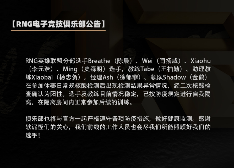 北京时间10月14号清早,正在EDG在S12小组赛A组认真角逐的时间,隔壁的RNG俱乐部却发了一则公告。公告的内容如下:RNG豪杰同盟分部选手Breathe(陈晨)、Wei(闫扬威)、小虎(李元浩)、Ming(史森明)选手,锻练Tabe(王柏勤)、助理锻练Xiaobai(杨忠贺),司理Ash(徐郁菲)、领队Shadow(金鹤)在参加休赛日通例核酸检测后出现检测效果非常情况,经二次核酸查抄确以为阳性。选手及锻练现在情况稳固,已按防疫规定举行自我隔离,在隔离房间内正常参加后续的训练。 让RNG粉丝最担心的事变还是发生了。昨日EDG中单SCOUT,DK打野三叔CANYON,GEN中单超威和2名工作职员分别确诊新冠。正在粉丝担心TES,JDG和RNG的队员和工作职员身段康健的时间,本日等来了如许的消息。就在这次S12开赛之前,网上就有过诸多LPL战队要不要去现场打角逐的讨论。由于去到真的场馆角逐,就算是防护工作做得再过细,还是多多少少会有安全缝隙。假如像是MSI那样隔空角逐,就没有这个隐患。但是不去现场角逐,又会碰到诸多技能标题,尚有舆论的标题。真的是让人头疼,去也不是,不去也不是。 就在RNG公告发出去不久,大量网友奉上祝福,渴望RNG全员早日病愈。很大概接下来D组小组赛第二轮角逐中,RNG在场馆角逐的只有GALA一人。便是是GALA带着四张椅子在角逐,假如RNG赢了,全部在场的媒体都只能采访GALA一个人。固然这个场景,带来的视觉打击力很大,但是渴望RNG不要由于这件事变影响到第二轮的状态。参考本日EDG中单SCOUT,就算在隔离房隔断空和队友一起角逐,状态还是很在线的。渴望RNG确诊新冠的队员早日病愈,平安全安归来。以上就是本篇豪杰同盟文章的全部内容,感谢阅读。 |
