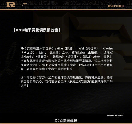 本日破晓,RNG电子竞技俱乐部公告:RNG选手Breathe(陈晨)、Wei(闫扬威)、小虎(李元浩)、Ming(史森明)选手,锻练Tabe(王柏勤)、助理锻练Xiaobai(杨忠贺),司理Ash(徐郁菲)、领队Shadow(金鹤)在到场休赛日通例核酸检测后出现检测结果非常情况,经二次核酸查抄确以为阳性。 选手及锻练如今情况稳固,已按防疫规定举行自我隔离,在隔离房间内正常到场后续的练习。 据官方工作职员消息,依据防疫政策,RNG将全队举行线上角逐。 (泉源:消息晨报官方微博) |