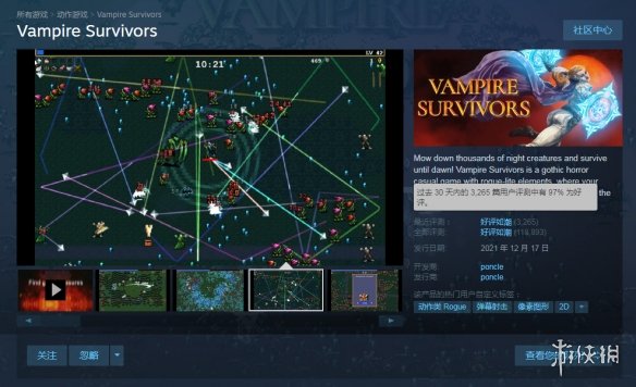 Steam 中毒系弹幕游戏《吸血鬼幸存者(Vampire Survivors)》公布将在10月20日推出1.0版本更新,预计到场一些新游戏内容,并调解游戏物品均衡,官方也抢先放出游戏OST,同样是白菜价。 《吸血鬼幸存者》于本年年初放出 Beta 版,兼具中毒性、反复嬉戏性、明确的目的尚有自制的代价。以上元素的加持下,在 Steam 上劳绩了压倒性好评(现在评价好评如潮,97%好评)。 即将到来的 1.0 版本预计将是正式版,官方公布代价将进步至4.99美元(约人民币35元,现价为25元)。还没购买的小同伴可以抓紧入手。 在正式版上线从前,官方将逐日于 Steam、Twitter、Discord 公布新谍报,现在已公开新到场的道具、脚色新造型、新的配景乐曲、UI 改进、原声带等,对本作有爱好的玩家可一连关注后续消息。 其他已知版本 1.0 的更新还包罗,游戏均衡、新游戏结果、官方字幕更新(包罗简体中文、日文等),同时游戏也预计于本年年末更新新的游戏引擎版本,届时玩家亦可选择嬉戏现引擎版本。 |