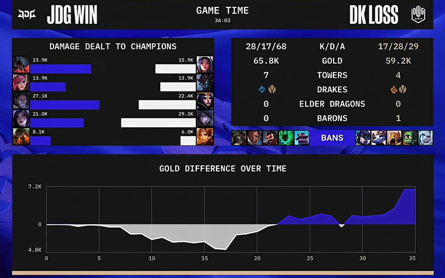 本日10月15号豪杰同盟S12小组赛,JDG战队先是输给DK一把,但在加赛环节打出翻盘局,乐成以小组第一身份晋级八强,369点燃剑魔像个战神,Nuguri被打得焕然一新,让我们来相识一下! 第一场比赛JDG三路对线劣势没打好,369凯南出大标题,打野也没有节奏。中期DK男枪打出代练级体现,各种横行霸道抢资源,发育速率快得令人称奇,等他掏出渴血战斧加饮魔刀,JDG战队就完全拿他没办法了。终极Canyon男枪打出11-0-3战绩,个人对位领先六千经济,JDG战队只能先输一分。 而第二把加赛369剑魔直接把传送换点燃,共同蔚越塔强拿刀妹一血,后续还完成单杀!不外JDG卡莎对线劣势,中野来帮却打出4换1团战,下路直接崩盘,养出厄斐琉斯大爹。16分钟JDG战队试图接先锋团,但卡莎落单被妖姬单切,后续剑魔没切死厄斐琉斯,迎来团灭,此时下路对位落后五千经济! 幸亏下一分钟比赛出现转机,DK拿到小龙还想强行集火剑魔。结果369剑魔吸引全部火力还没死,DK厄斐琉斯落单没人保,JDG连杀四人追回差距!23分钟JDG战队继承正面接团连杀四人,野辅双锁头非常克制厄斐琉斯,只要强杀AD就没人能对369剑魔造成威胁,惋惜卡莎塞拉斯被妖姬偷了。 28分钟DK战队找机遇强秒大龙,JDG蔚入场被秒。但后续JDG强行锁头秒掉厄斐琉斯,369剑魔继承乱杀,DK战队再次输掉团战。33分钟DK妖姬走脸吃钩被瞬秒,只剩四人还想守高地,然后就被JDG冲脸打团灭!终极JDG战队在AD对位落后五千经济的情况下翻盘DK战队,以小组第一的身份晋级八强赛! 只能说JDG战队打出了LPL队伍应有的血性风格,当Kanavi选出蔚的时间教学还以为这个豪杰选择很差,RNG/EDG/TES都用蔚打野输给LCK队伍。结果JDG战队根本无惧天肥厄斐琉斯,团战就盯着他一人冲就行了,几个锁头豪杰让对手失去操纵空间! DK刀妹太废了,妖姬也打不动前排,只要厄斐琉斯倒了就失去伤害泉源,369剑魔彻底砍爽了!369剑魔带点燃单杀刀妹,打出10-1-11战绩,那波河道一扛五成比赛最大迁移变化点,后续每波团战都像个战神,DK战队根本处置惩罚不掉他,五个人看到他都只能逃跑!369敢带点燃真的太有自负了,他就是信赖本身能打穿刀妹,要是没打出结果说不定就要背锅了! 反观Nuguri刀妹打出1-8-2战绩,对线崩盘打团零作为,搞得DK战队跟4打5一样,跟之前那把鳄鱼一样坑,LPL教学光荣:“还好他选刀妹,选剑姬保AD都挺难打的,大概选个奥恩,选什么都比刀妹好一点!” DK战队信赖Nuguri才让中野当工具人,但他有剑姬不选,拿刀妹被打成笑话,恐怕镌汰赛都只能拿个肉混一混,乃至都有大概被抬了局了。网友不禁感慨:“很想信赖这刀妹是从前谁人牛宝玩的,差距怎么这么大?”Nuguri休赛半年回归DK以后不绝都是这种萎靡不振的状态,当初的冠军上单变得焕然一新,沦为队伍突破口,着实是令人唏嘘啊! 那么各人对于JDG翻盘DK的这场比赛有何见解?接待留言,分享你的见解! |