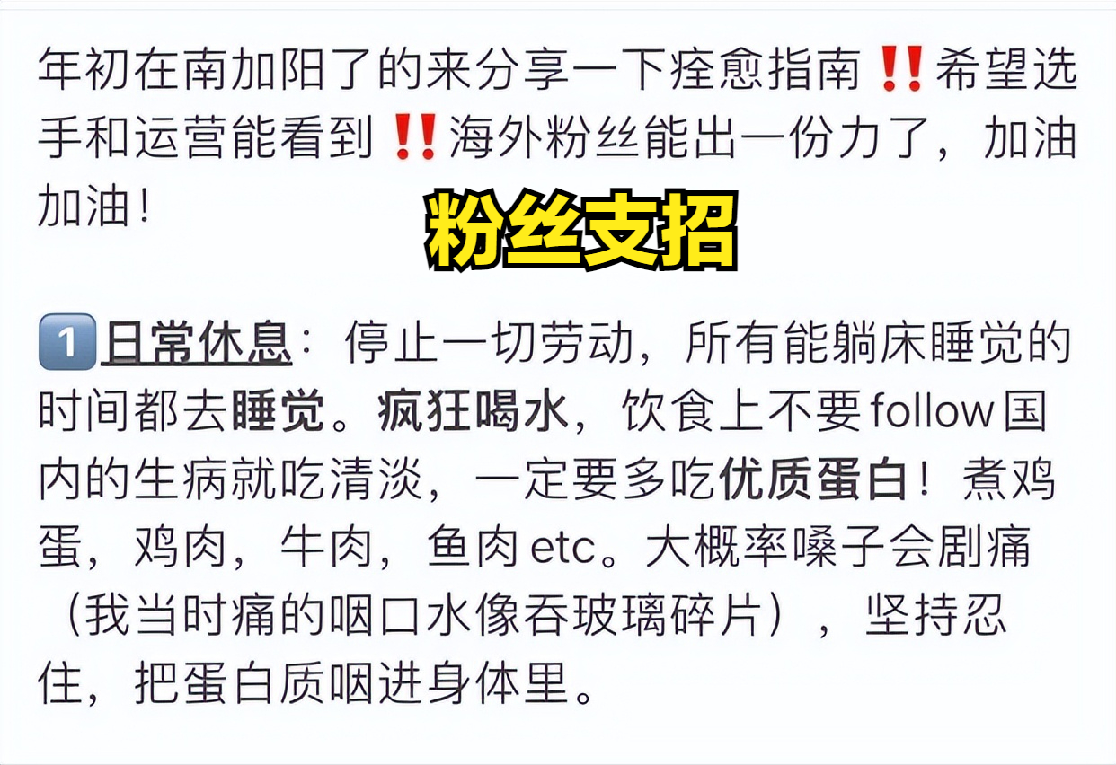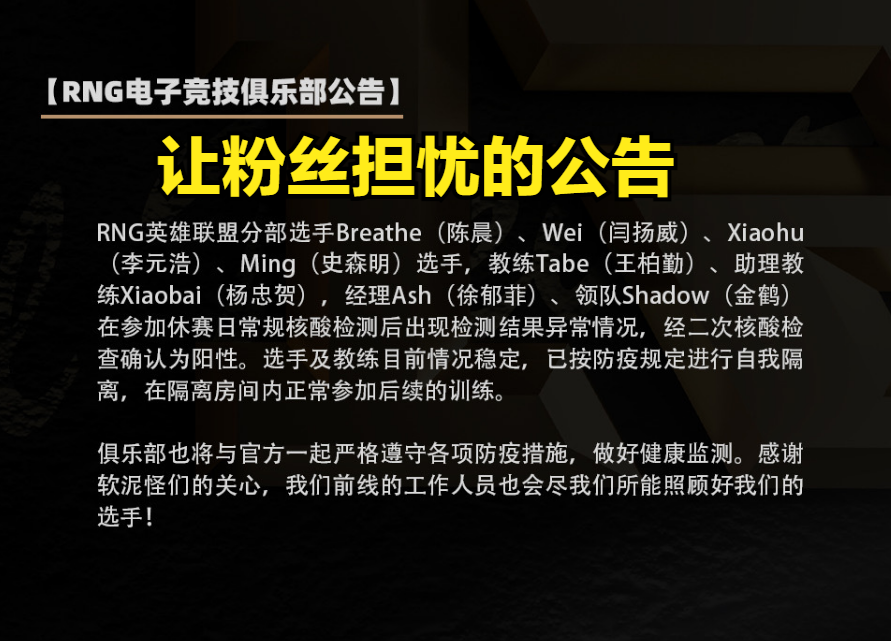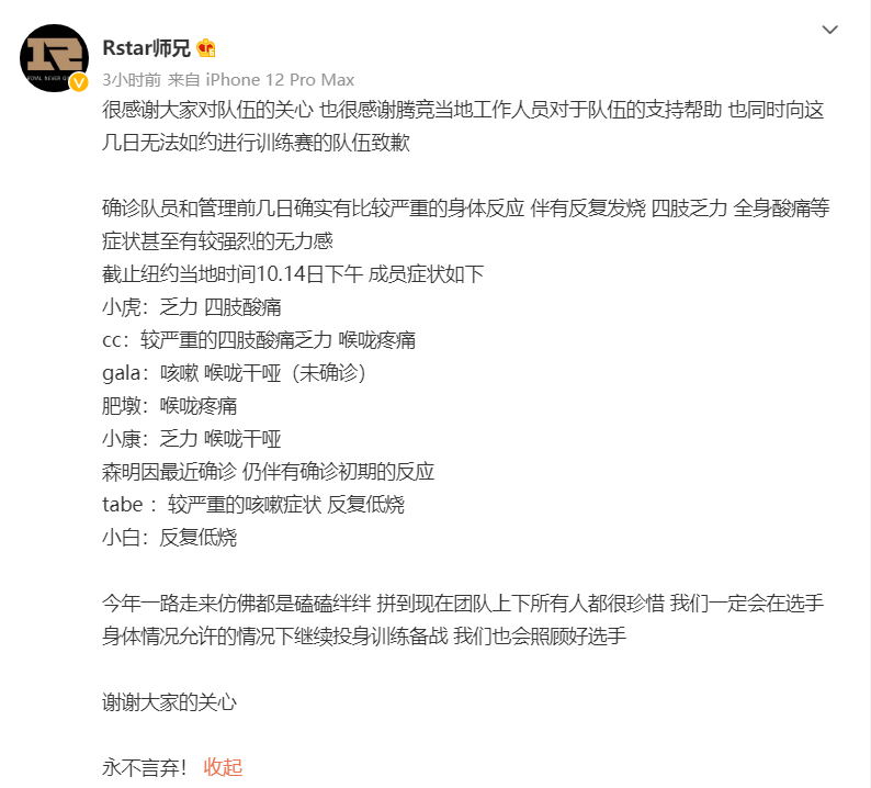 北京时间10月15号上午六点,RNG电子竞技俱乐部运营负责人,Rstar师兄公布了火线的一些最新资讯。各人最为关心的RNG五虎身材状态题目,Rstar师兄也是把众人身材状态逐一枚举。 小虎:乏力 四肢酸痛 呼吸哥:较严肃的四肢酸痛乏力 喉咙疼痛 gala:咳嗽 喉咙干哑(GALA没有确诊) WEI:喉咙疼痛 小明:因近来确诊 伴有确诊初期的反应 让RNG粉丝最为担心的变乱照旧发生了,从Rstar师兄公布的众人身材状态来看,RNG五虎除了未确诊的GALA,其他队员的症状都很显着。固然说B组是后天才开始角逐,但是以五虎现在的状态来看,能全部规复到正常状态的概率不高。RNG首轮取得完善的三战全胜战绩,只要第二轮能正常发挥,乃至只发挥8乐成力,要出现的难度照旧不大。但是现在这种身材状态,能否起床打角逐都成题目。 随后大量网友在RSTAR师兄的文章下面留言,很多网友给出很多发起,叫RNG众人参考一些外洋博主的全愈履历,并枚举了很多规复小妙招。无论怎样,RNG粉丝照旧很担心RNG全员的身材状态,品评区不绝有粉丝为RNG送出祝福。Rstar师兄还特别提到,他们团队会照顾好选手,而且会在选手身材环境允许的环境下,让选手继续投身训练备战。 参考昨日有关RNG的消息,根据拳头公布防疫政策:若一个队三人以上检测效果为阳性,则全队转为线上角逐。在检测效果阳性后,岂论期间是否转阴,五天内无法进入场馆。RNG角逐于北京时间17日举行,首场角逐是五点100T,打故将全队线上角逐。本日的Rstar师兄的发文一出,RNG从全员线上角逐,酿成能否准期全员上线举行角逐。不得不说,让RNG粉丝的生理落差挺大的。就算退一万步,身材第一,角逐第二,假如RNG队员的身材状态着实规复得不理想,D组第二轮延期大概RNG直接弃权都是备选方案。等候RNG的全员能早日全愈,渴望来日诰日能比及来自RNG火线的好消息。以上就是本篇好汉同盟文章的全部内容,感谢阅读。 |
