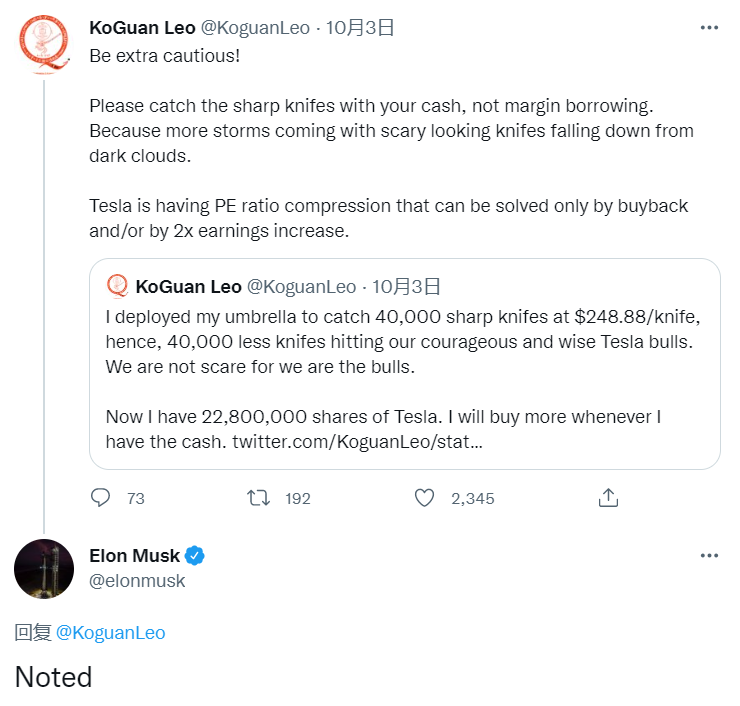 特斯拉股价已经从汗青高位下跌50%。美联储政策收紧带来的市场抛售正对以特斯拉为代表的发展股造成严肃的打击。 本周五,特斯拉股价收跌7.6%,至204.99美元。股价较客岁11月4日创下的409.97美元高点已经腰斩,公司总市值回落至6420亿美元。 “斲丧者大概推迟购买” 陪同着美联储连续政策收紧,以特拉斯为代表的美股发展股遭遇严肃打击。斲丧者正为高通胀、利率连续上升和大概的经济阑珊做预备。 在根本面角度,特斯拉正遭遇一系列困难:由于物流题目,公司三季度汽车交付受到影响。华尔街分析师告诫,特斯拉汽车代价的攀升大概会在某个时间对需求造成压力;与环球险些全部其他汽车制造商一样,特斯拉还须要应对供应短缺和原质料本钱飙升的题目。 特斯拉将于10月19日公布第三季度财报。在财报发布前,富国银行分析师Colin Langan将特斯拉股价目的代价从280美元/股下调至230美元/股。Langan告诫,只管在美国国内生产更多电池,可以资助特斯拉得到《通胀淘汰法案》(IRA)提供的额外税收减免,但经济远景和利率连续攀升大概对公司构成巨大的下行压力: 如果斲丧者关注本钱,6万美元的汽车购买大概会被推迟。 对于公司三季度表现,Langan现在预计特斯拉三季度红利将略超预期,但公司匀称贩卖代价大概会受到强势美元的打击。 回购大概不是最告急的事变 股价连续下跌之际,市场也在推测马斯克是否会回购以支持股价。 对于回购听说,马斯克也给予回应。本月初在针对交际媒体上发起公司回购的留言时,马克斯回应“留意到了”。 但对于马斯克来说,回购股票大概不是最为急迫的事项,其正面对来自推特方面越来越大的压力。 根据推特的代表状师在特拉华州的一份法庭文件,马斯克因其试图收购推特变乱,正在担当美国当局的观察。 早在本年5月,美国证券生意业务委员会(SEC)和美国联邦贸易委员会(FTC)曾对马斯克睁开观察。马斯克于4月4日公开表现已经收购推特超9%的股份,成为公司最大股东之一。根据规定,当投资者购买一家公司超5%的股份时,必须向SEC提交一份表格披露信息,但马斯克却比规定时间晚提交至少10天,且提交的是通常为被动投资者(passive investors)预备的表格。 在推特收购案方面,特拉华州大法官kathleen McCormick已经发出指令,要求两边于10月28日下战书5点之前完成生意业务,否则将在11月重新开启庭审。 |