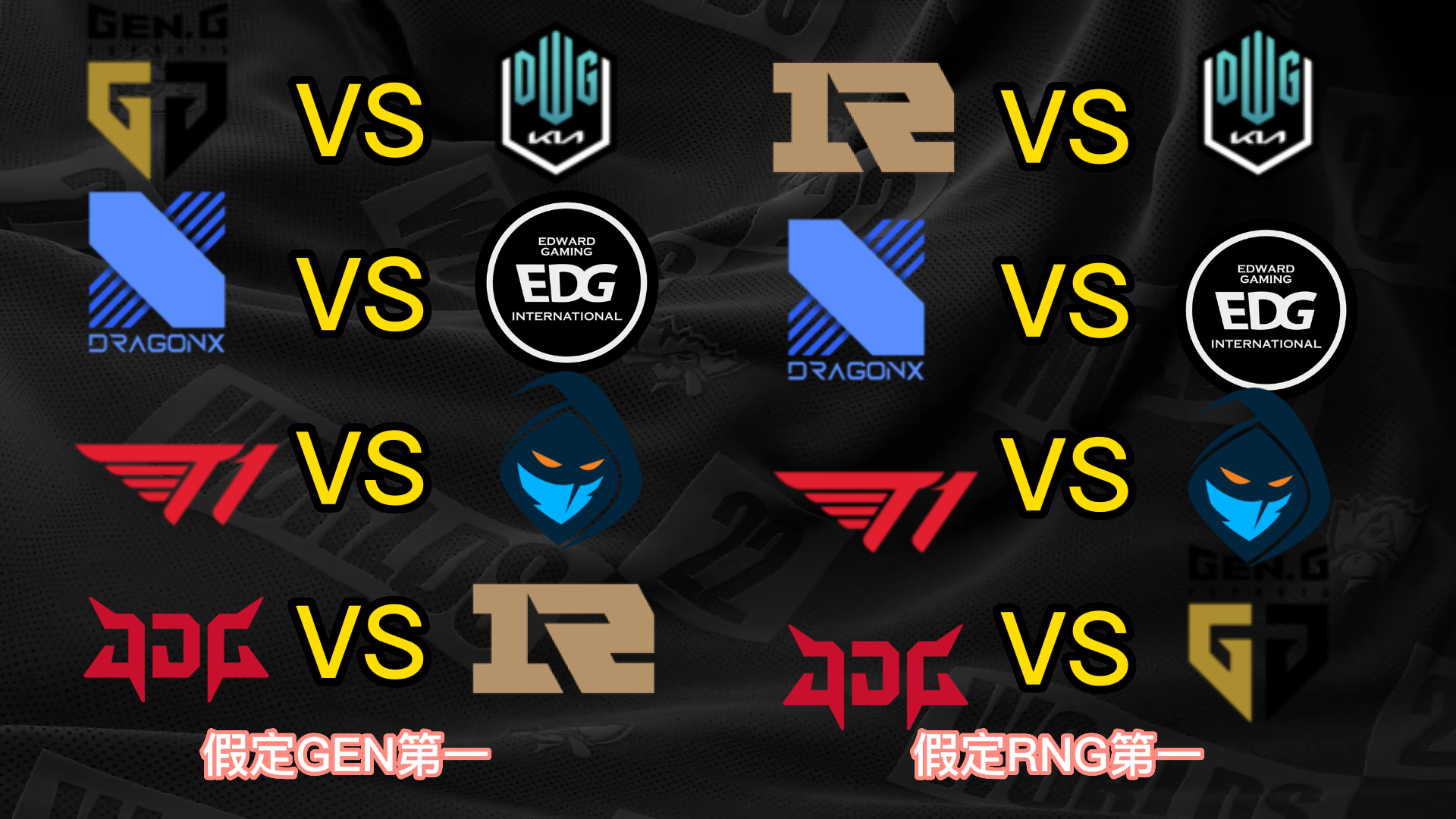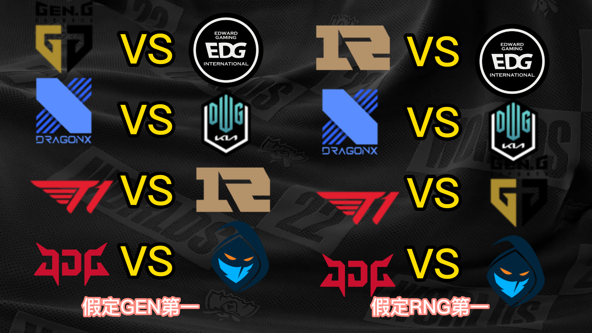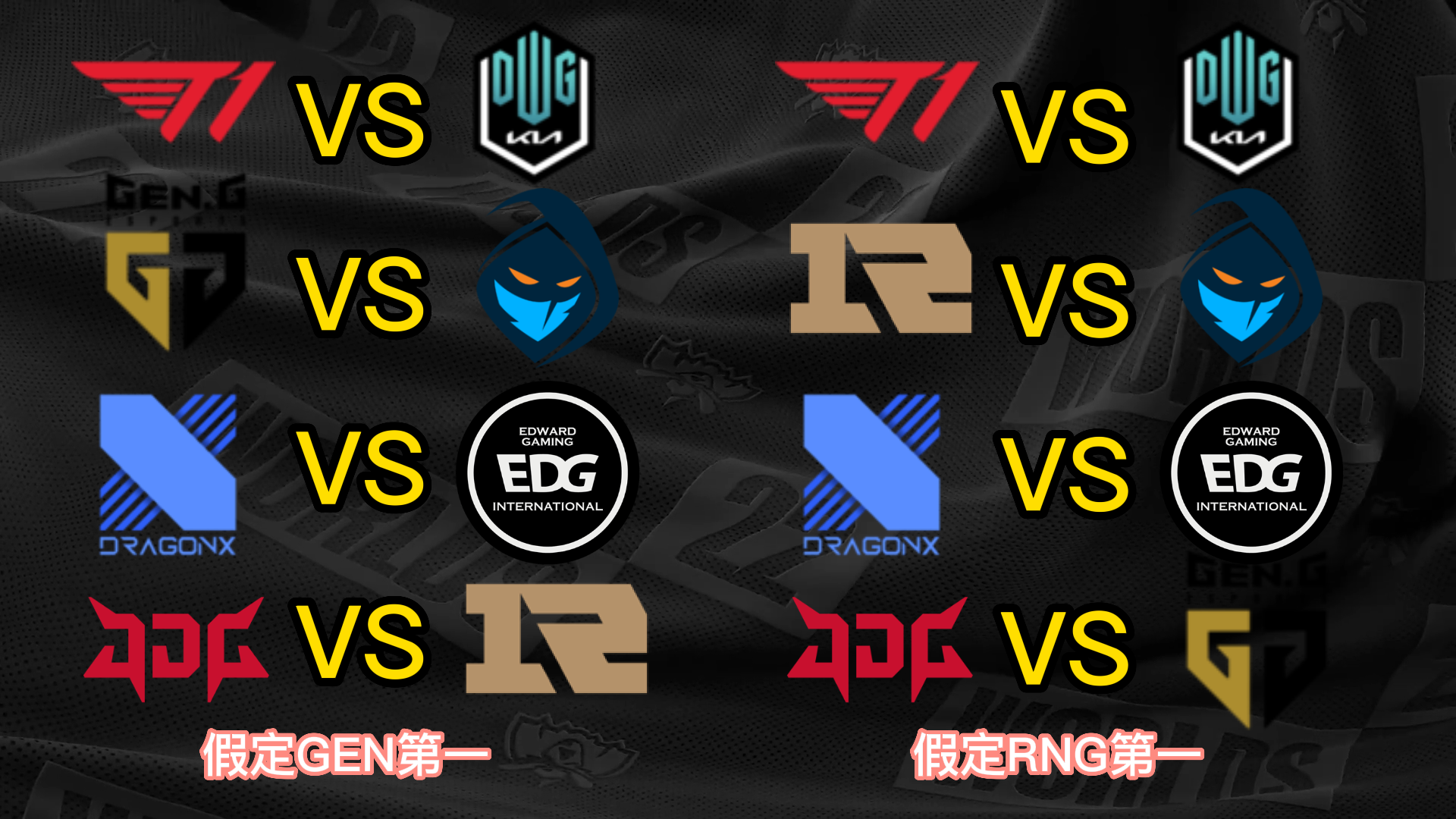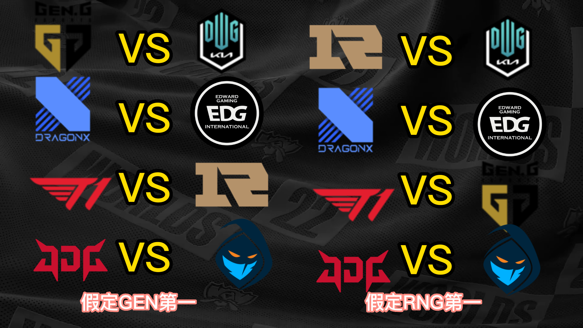 S12小组赛已经只剩末了一个小组的出线战役夺,而八强已经六个席位确定,分别是小组第一晋级的T1、JDG和DRX,尚有小组第二晋级的EDG、DK和RGE,末了两个席位将由GEN、RNG、100T和CFO四队夺取。 不外思量到D组的力气差距比力大,因此99%可以确定就是GEN和RNG晋级,只不外牵挂在于谁是小组第一。固然RNG在首轮比武击败了GEN,但是本着先质疑再质疑的精力,我们还是猜疑RNG拿不到小组第一,以是接下来也将分GEN第一和RNG第一两种情况举行八强对决的抽签分析。 先分析八强抽签的两个根本规则,第一个规则是小组第一打另一个小组的第二,第二个规则是同小组的战队在决赛前都不会相遇,也就是肯定分在差别半区。 这两个规则导致抽签效果在不思量战队位置的情况下一共只有12种大概: (以B组第一JDG为例,和他同半区的小组第一有3种大概,他八强对手的小组第二只有2种大概;此时另一个半区只剩两个小组第一和两个小组第二,比武形势只有两种大概,以是效果是3*2*2=12种) 算上GEN和RNG名次不确定,那么也就是24种大概。以下是全部的抽签大概效果。 你们以为哪种抽签效果是你最想看到的呢? |