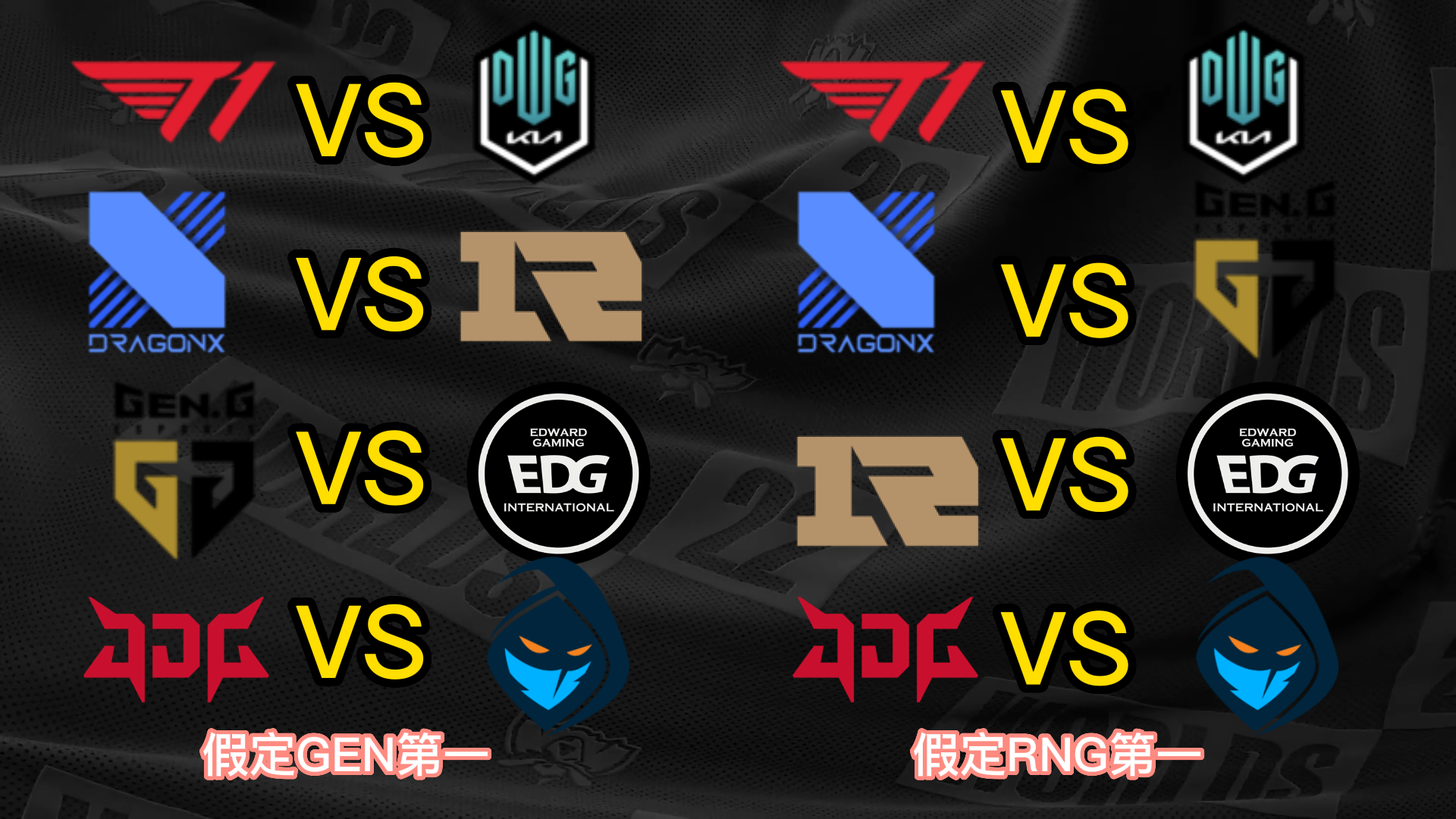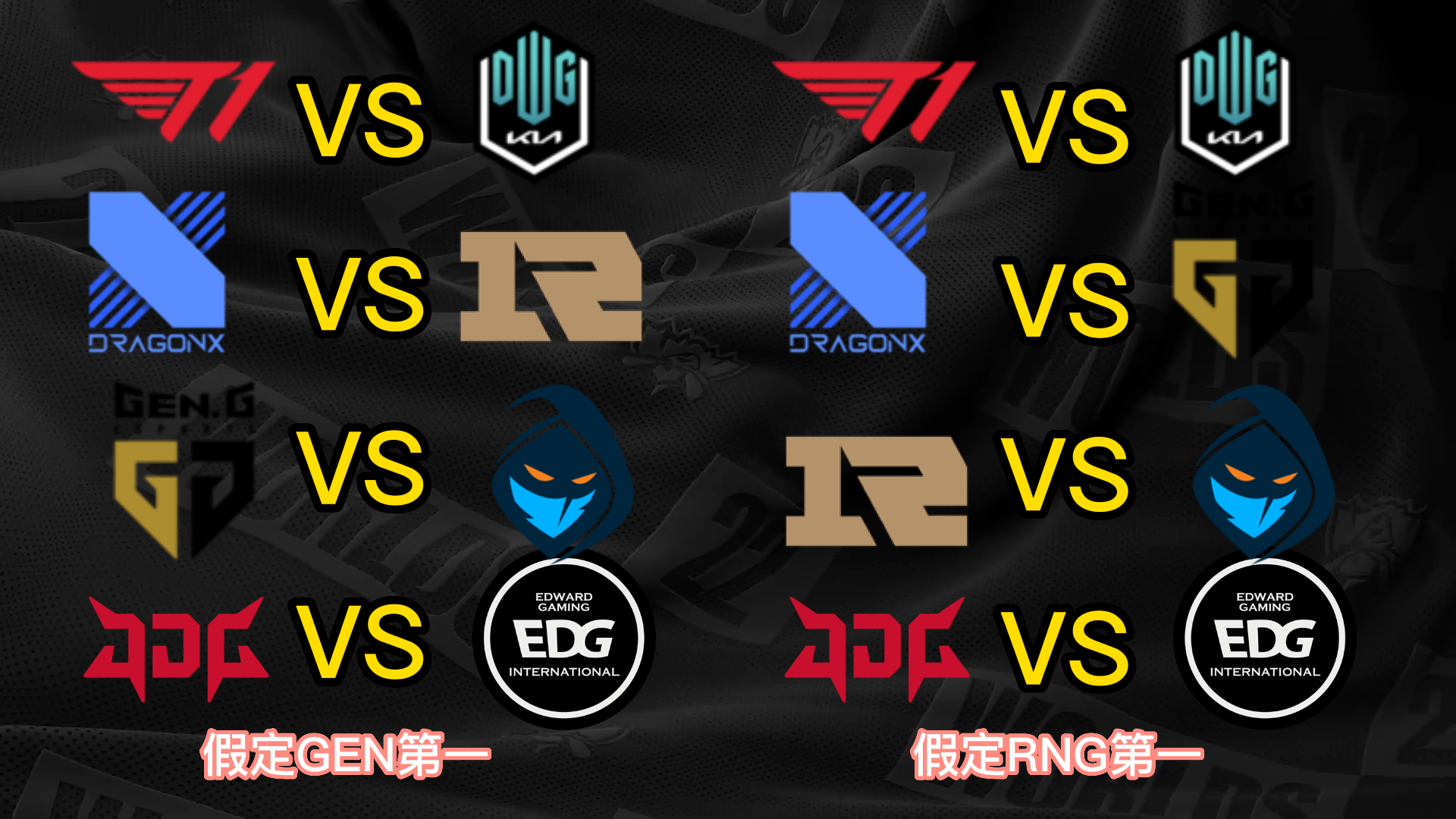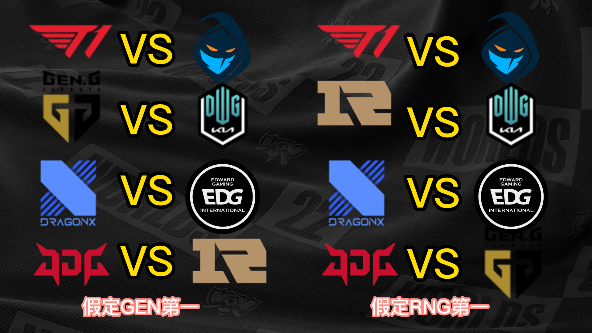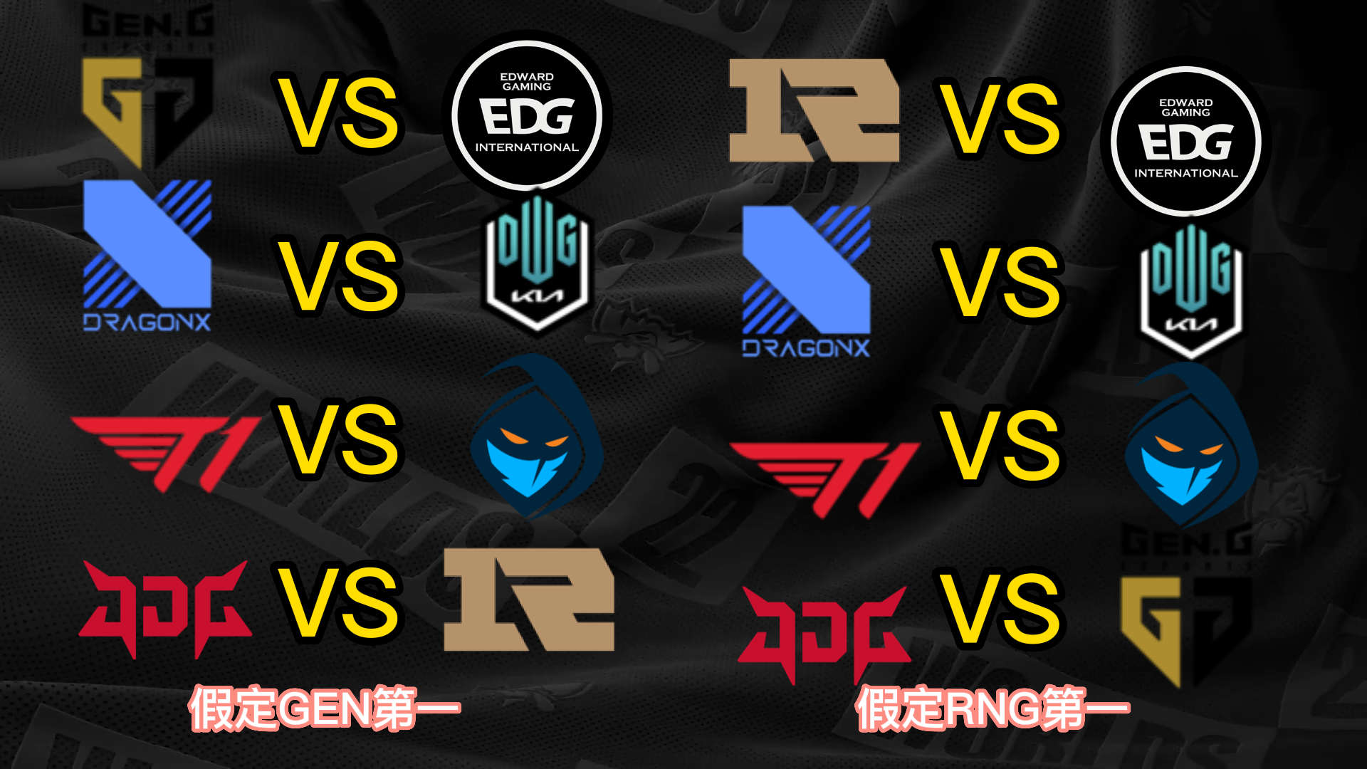 S12小组赛已经只剩末了一个小组的出线战役夺,而八强已经六个席位确定,分别是小组第一晋级的T1、JDG和DRX,尚有小组第二晋级的EDG、DK和RGE,末了两个席位将由GEN、RNG、100T和CFO四队夺取。 不外思量到D组的力气差距比力大,因此99%可以确定就是GEN和RNG晋级,只不外牵挂在于谁是小组第一。固然RNG在首轮比武击败了GEN,但是本着先质疑再质疑的精力,我们还是猜疑RNG拿不到小组第一,以是接下来也将分GEN第一和RNG第一两种情况举行八强对决的抽签分析。 先分析八强抽签的两个根本规则,第一个规则是小组第一打另一个小组的第二,第二个规则是同小组的战队在决赛前都不会相遇,也就是肯定分在差别半区。 这两个规则导致抽签效果在不思量战队位置的情况下一共只有12种大概: (以B组第一JDG为例,和他同半区的小组第一有3种大概,他八强对手的小组第二只有2种大概;此时另一个半区只剩两个小组第一和两个小组第二,比武形势只有两种大概,以是效果是3*2*2=12种) 算上GEN和RNG名次不确定,那么也就是24种大概。以下是全部的抽签大概效果。 你们以为哪种抽签效果是你最想看到的呢? |