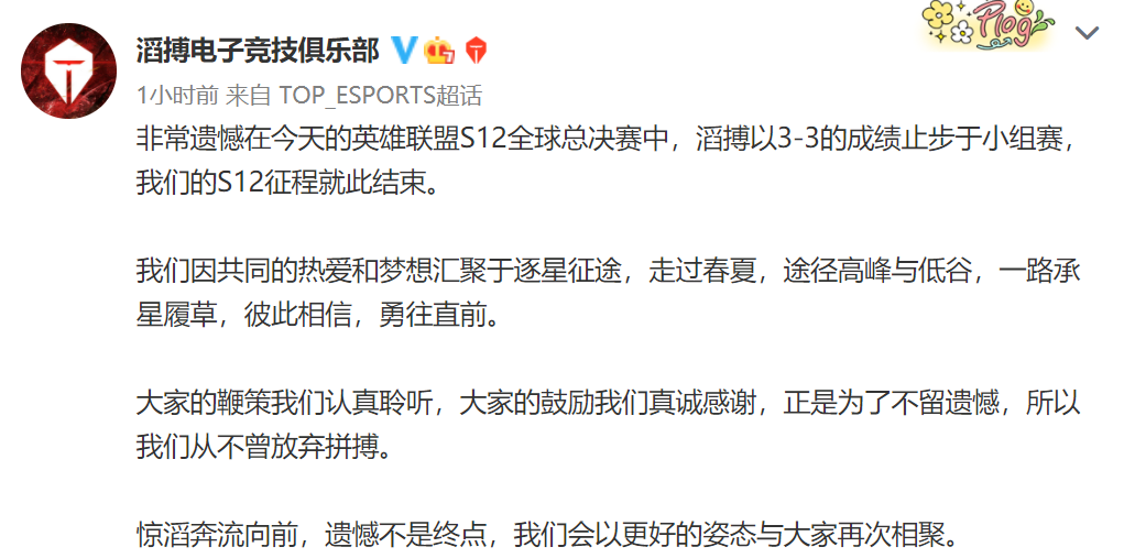 韶光荏苒,2022好汉同盟举世总决赛在10月16日的赛程迎来终章,非常遗憾,固然来自LPL赛区的TES打败了LEC新王RGE、LCK劲旅DRX,但他们没能降服力气稍弱的GAM战队,以3胜3负的数据竣事小组赛之旅。至此TES成为本届天下赛开启至今,首支遭到镌汰的LPL战队,止步16强,这也革新了TES在天下赛的最差战绩。 转头看看TES众将走过的路,踏足S12举世总决赛,Qingtian稳坐替补席,大黄Wayward、Tian、Knight、阿水Jackeylove、Mark打满小组赛。本来以为LPL二号种子队伍可以大概轻松晋级八强,没曾想慢热的TES未能实时进入状态,在首轮小组赛仅仅取得了1胜2负的战绩,为TES小组赛出局埋下了伏笔。 步入第二轮小组赛,TES想要反超RGE、DRX,搭上通往八强镌汰赛的末班车,就必须只管斩获三连胜,大概连LPL官方教学都未曾推测,在与RGE、DRX再度交锋之前,TES会倒在GAM脚下,随着越南战队GAM斩获自己在本届天下赛的首胜,且DRX接连得胜,TES失去了晋级八强的末了渴望。 面临大失所望的观众,TES俱乐部发长文回应:很遗憾,TES止步16强小组赛,天下赛之旅戛然而止,因热爱与空想汇聚于此,我们有过高光时候,也曾跌落谷底,相互扶持,勇往直前,故事尚未闭幕,在将来的日子里,TES会以更好的姿态与各人邂逅。要知道2022LPL冬季转会期将在11月下旬拉开帷幕,队内主力选手Knight、小天、Jackeylove条约悉数到期,TES新赛季阵容留有牵挂。 有人高兴有人愁,TES落寞离场,而DRX以C组一号种子的身份突入八强镌汰赛,主力ADC羊驼Deft和首发打野Pyosik继承专访。与LOL天下冠军辅助BeryL携手作战,羊驼Deft感慨道:多次到场天下赛,没感觉自己有什么进步,此番征战2022好汉同盟举世总决赛,只要以为自己进步了,足矣。 另一边DRX打野Pyosik放出豪言,期待LCK承包四强:即便败给TES,我们仍旧是C组的一号种子,在即将到来的八强镌汰赛,DRX会打得更好,为了资助Deft哥夺得LOL举世总冠军奖杯,我会继承积极。别的我不渴望在八强镌汰赛碰到LCK战队,渴望韩国队伍发挥精彩,承包S12举世总决赛四强。 综合分析四支战队在C组小组赛的体现,斩获一波连胜的DRX愈战愈勇,接连不敌DRX、TES的欧洲LEC新王RGE高开低走,而Levi领衔的GAM状态连续低迷,仅仅带走一场胜利,最让粉丝倍感遗憾的队伍,还是LPL二号种子TES。 不管是选手的线上克制力,还是在团战中的利用上限,TES都堪称一流,但在关键局,TES战术实验力严肃不敷,乃至连队内沟通都出现了标题,这阐明TES主力队员的心态不敷稳固,难以顶住压力,终极落寞离场。把祝福送给披挂上阵的五位TES选手,渴望他们可以大概在新赛季更进一步。 |