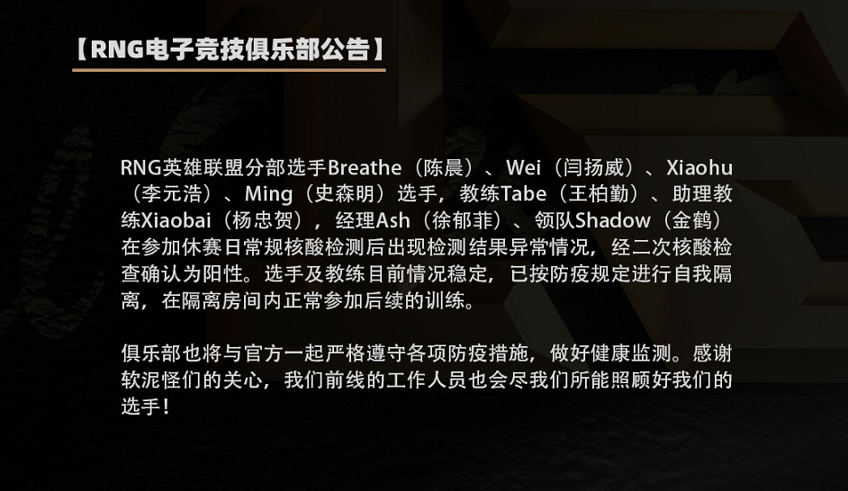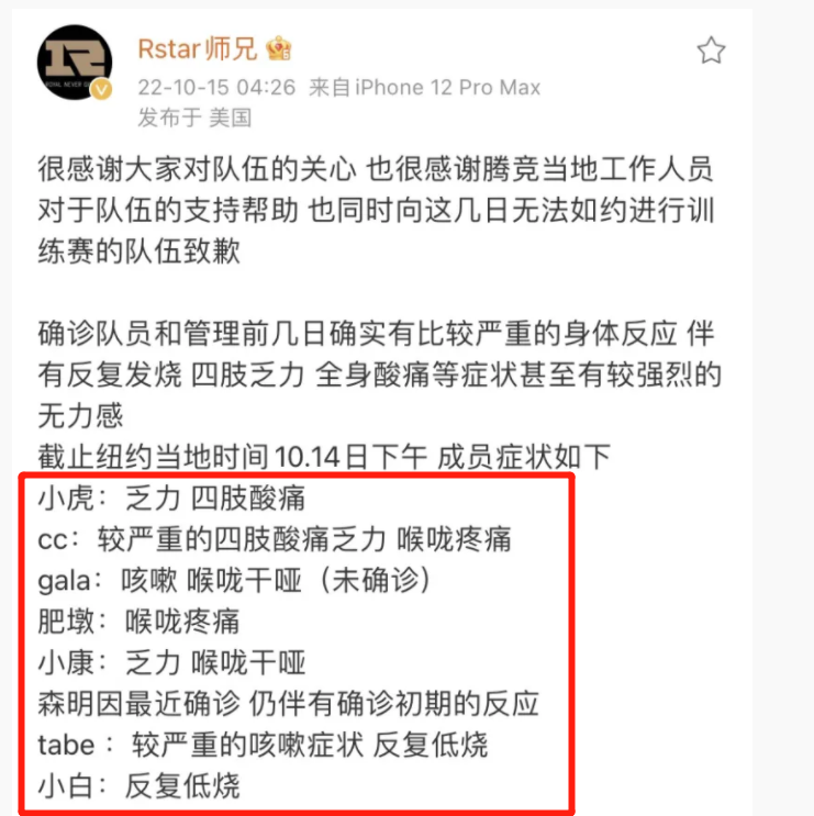 本年LPL团体的发挥,让很多的小搭档都充满了盼望,由于本年的LPL团体来说,黑白常强的,JDG和RNG在小组赛第一轮,都拿到了第一名的好结果,而且EDG现在也乐成晋级了。大概TES是有些许困难,不外近几年来,LPL在国际赛事上面,都拿到了不错的结果,以是本年各人也都不会放弃。 RNG小组赛真要警惕了?领队发布队员症状,呼吸哥最严峻! 随着A组的EDG以小组第二出线,B组的JDG以小组第一出线之后,压力也来到了TES和RNG这边。但是近期官方发布出的一些消息,让很多网友都有点担心起来。如果正常环境下的RNG战队,很多网友还是非常信任,他们可以突出重围,以小组第一的身份出线,但是现在来看,RNG大部门职员都“中招”,这一消息让网友们都非常的头疼。 除了朱开和gala之外,其他的人全部都确诊了,这让粉丝们都开始担心起来,很快他们就要迎来小组赛第二轮的角逐了,如果在第二轮角逐当中,没能打出好结果的话,那么出线大概就会非常伤害了。那么现在对于RNG来讲,出现局面是什么样子的呢? 实在对于RNG来说,他们想要出线,还是很简单的,他们在第二轮只必要降服CFO,然后GEN.G也降服CFO,就能包管小组第二稳出线了。想要争取小组第一的话,那就必须要降服GEN.G才行,毕竟这个小组其他两支队伍,想要扯下GEN.G一分,那还是非常难的事变。以是总的来说,RNG的出现局面,相当的清朗。 小威症状最轻,小虎四肢乏力让人担心! 但能否包管自己在第二轮,可以发挥出好状态不翻车,是一个很关键的事变。当前RNG的各人兄Rstar,在微博上面也对各人展示了,当前队伍当中几位选手的状态。gala固然说没有确诊,但是近期却开始咳嗽,毕竟天天都生存在一起,大概已经是有症状了。但也有大概是流感,毕竟现在迎来了换季。 其次wei是最轻的,只是有喉咙疼痛,没有咳嗽,看来是真的有九阳神功护体啊。其次就是史森明白,由于是近期确诊的,只是有初期的反应,而小虎则是乏力,四肢酸痛,如许的症状则会影响到选手的发挥。呼吸哥是最严峻的,不光四肢酸痛乏力,乃至喉咙还很疼,看来在后续的角逐当中,这几位选手,是真的要留意一下才行了。 除此之外,副锻练tabe有咳嗽和反复低烧,小白也有反复低烧,替补辅助小康当前还好,并不是那么的严峻。但谁能想到出去打一个角逐,却引来了这些祸根呢?只能说先包管自己的身材康健,再去好好备战角逐吧,毕竟身材擦?鲱告急的,也等候这两天他们可以好好的修养,在打角逐的时间规复康健吧! |