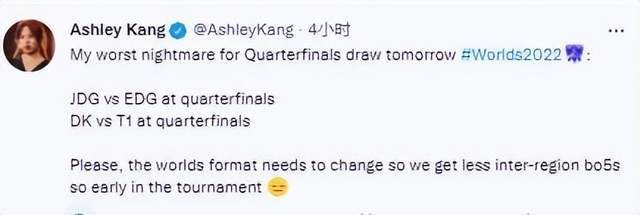 随着S12第二轮C组出线战结果出炉,RGE与DRX两支队伍携手晋级,而如今本届S赛八强中已经有六支队伍锁定席位,LCK赛区已经三支战队晋级八强,不出不测Gen.G也将在D组顺遂拿到一个出线名额。因此在小组赛快要竣事前,着名韩媒电竞记者Ashley Kang对八强赛大概出现两大赛区队伍内战的环境提出了担心。 由于近来几年LPL与LCK赛区在天下赛舞台的竞争力越来越强,每每小组赛竣事后LPL与LCK两大赛区的队伍会占据八强席位中的绝大多数。因此近来几年天下赛,常常会出现镌汰赛阶段LPL或LCK赛区内战的环境。好比客岁RNG和EDG两支队伍就是在八强内战,固然这确保了最少一个四强席位,但是同一赛区的队伍内战显然是各自赛区观众、粉丝不乐意见到的环境。 而Ashley Kang作为着名韩媒电竞记者,这次她也是在交际媒体上发文担心道:“假如八强赛JDG vs EDG或DK vs T1,来日诰日S12八强抽签就是我最可骇的噩梦。”跟这位电竞记者有同样观点的尚有LPL与LCK赛区的观众,毕竟与外赛区队伍的对抗才是S赛出色的部分,假如八强都是内战也会让角逐少了许多看点。 在这条推文中,Ashley Kang也是直言天下赛的赛制须要来一些改变,如许就不会太早看到各赛区队伍在BO5内战。如许的发起得到了不少观众的认同,毕竟差别赛区的碰撞才是S赛的魅力所在。 网友们怎么看这件事呢?接待在下方品评区留言,分享自己的看法。 |