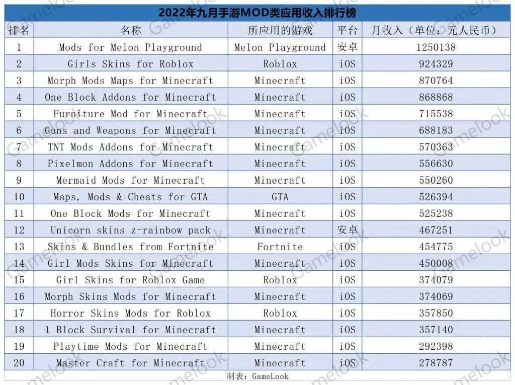 俗话说得好,“上了PC,穿什么就由不得你了”。 从十几二十年前在各大论坛留下邮箱、QQ求美意的楼主发文件,到厥后从国内一众玩家网站下载,再到如今的Steam创意工坊一键订阅、主动更新,MOD不停以来就是很多PC玩家体验游戏时的紧张兴趣泉源之一。 时至本日,PC上的MOD生态实在已经成为很多游戏和开发者赖以生存的关键,对于部分产物及背后的开发团队而言,一个生动的MOD社区每每可以大大淘汰官方游戏内容的更新压力,乃至大幅延伸游戏的寿命,这也直接导致不少游戏开发团队会主动推出、维护实用于游戏的MOD开发工具或文档,以资助玩家发挥自己的创意。 不外由于主机体系的封闭性以及手游鼓起得相对滞后,MOD一度是属于PC玩家的独家非官方游戏内容。固然时至本日,主机的封闭性依然没有改变,但手游的现状却早已有了翻天覆地的变革,同样的当动手游MOD、插件类产物的市场和发展大概高出了很多人的预期。 月下载量破百万,Minecraft类MOD一骑当先 上图是GameLook根据第三方ASO平台的数据整理而成的,本年9月全平台手游MOD类应用下载量前20的榜单。 在详细产物中,除了Mod资源聚合类应用,好比“Mods for Mincraft Marster”等,游戏皮肤和游戏内资源的MOD则是玩家最喜痪?载的两大内容。 就好比“FFF FF Skin Tool”,就是一款面向Garena旗卑鄙戏《Free Fire》的皮肤、心情、动作等相干内容的解锁、领取、应用工具。玩家只须要选择自己想要的皮肤或武器等相干内容,在应用中点击“激活(Activate)”之后,等候数个广告,就可以打开游戏,体验相干资源了。 再好比Minecraft的《MCPE Mermaid and Tail MOD》,正如其名,就是可以让玩家在游戏中化身尤物鱼,增长玩家在游戏的水域中游动速率的同时,还为游戏参加了鲨鱼宝宝、水下独角兽等内容,丰富游戏的内容和玩家的体验。 固然作为一款玩家社区相称生动的产物,Minecraft也有着一些独特的MOD应用,排行第19的“Realistic Shader Mod”就是一款用于手机版Minecraft进步画质的应用,该应用可以为我的天下口袋版(MCPE)添加多个绘制缓冲区,阴影舆图,法线舆图,镜面舆图等,并答应高性能的硬件在手机上运行4K纹理的Minecraft。 而从团体来看,大概得益于安卓体系相对更加开放的生态,安卓用户对于MOD类产物的需求可以说远高于苹果用户,在前20中,全部产物都拥有安卓端应用,但只有两款产物登岸了iOS端。而在此中,Minecraft无疑是MOD开发者和玩家最青睐的游戏,6款月下载量高出100万的产物中,5款都是Mincraft相干应用,20款产物中,有16款产物都围绕着Minecraft开发。 不外固然在下载榜前20里存在“Realistic Shader Mod”这种硬核的应用,但该榜单上的大部分内容,从反复以各种情势、名称出现的“Mods for Mincraft”不难发现,其焦点逻辑依然是依靠集成已有的互联网MOD资源,然后卖应用内铺满屏幕的广告,在团体内容的质量上,依然有待提拔。 iOS用户付费积极,苹果版堡垒之夜MOD竟上榜 上图是GameLook根据第三方ASO平台的数据整理而成的,本年9月全平台手游MOD类应用收入环境前20的榜单。差别于下载榜被安卓阵营的产物霸榜,在收入榜上,苹果用户高付费的性子就得到了充实表现,安卓端上榜的产物仅有两款,别的均是iOS应用。 而从收入规模来看,这些MOD开发者已能实现月几十万人民币的收入,仅靠做手游MOD年入数百万的开发者也有了几十位之多。 而且榜单第一的产物也不测地不是Minecraft相干的应用,而是一款针对名为《Melon Playground》的产物。《Melon Playground》是一款由独立开发者TwentySeven研发,是一款使用爆炸和粉碎性内容为玩家解压的沙盒模仿游戏,玩家可以使用各种武器、道具击杀对手。 而“Mods for Melon Playground”则答应玩家下载各种游戏内的道具、武器、NPC等内容的资源聚集应用。而之以是它可以或许逾越其他一众产物,成为榜单上唯一月收入突破百万的应用,缘故原由除了应用有丰富的资源、铺天盖地的广告外,很大概由于其昂贵的订阅费用。差别于大多数订阅服务按月收费,该产物的付费周期是一周,而代价更是高达15美元,折合一个月60美元。 固然如果放眼整个榜单上的应用,皮肤类MOD可以说是最赢利的分类,无论是Roblox符合Minecraft,各种女生皮肤、可骇主题皮肤、尤物鱼、独角兽皮肤等产物,收入环境都相称不错。 而在此中,如果皮肤可以或许与游戏的玩法相联合,而不是单纯地改变表面,则自然可以卖得更好,就好比两个Minecraft的变形Mod“Morph Mods Maps for Minecraft”和“Morph Skins Mods for Minecraft”,这类MOD除了会为游戏引入各种差别的表面、舆图的同时,每每还会增长一些新的游戏机制,就好比答应玩家在杀死怪物后变形成任何怪物等,丰富游戏的内容。 但在榜单中,最让GameLook不测的是一款针对Fortnite的iOS端MOD应用,要知道iOS上Fortnite还未规复上架,除了一部分两年前游戏下架时就下载有该游戏的装备,其他玩家仅能以网页云游戏的模式嬉戏该产物。在这一配景下相干应用还可以或许劳绩超45万人民币的月收入,属实让人不测。 固然除了Minecraft、Roblox这些热门手游的MOD外,两个榜单上均有GTA相干的产物上榜,且都是与PC或主机端的游戏的作弊码相干的产物,也足以证实GTA这个IP的影响力。 想当年笔者在网吧体验《GTA罪过都市》时,还须要在网上各大论坛搜刮各种作弊码和MOD,如今的玩家只须要每周耗费6美元(Maps, Mods & Cheats for GTA),相干内容就唾手可得。 开放生态