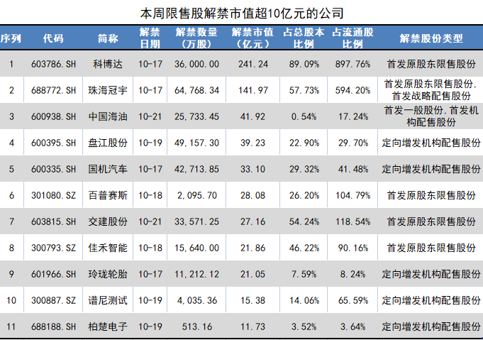 记者 | 张艺 编辑 | Wind数据体现,剔除新上市公司,本周共有50家公司限售股解禁,解禁数量33.16亿股,以最新收盘价盘算(下同),解禁市值706.34亿元。科博达(603786.SH)、珠海冠宇(688772.SH)两家公司解禁市值过100亿元。 根据公告,车载控制器龙头科博达10月17日有3.60亿股首发限售股解禁,约合解禁市值241.24亿元。解禁数量占比极大,占总股本比例89.09%,解禁后公司流通盘大增约9倍。 科博达三年前上市,本次解禁股东共11位,包罗第一大股东科博达投资控股有限公司,实控人柯桂华、柯炳华等。 值得注意的是,大规模解禁相近,近三个交易业务日科博达股价走出了三天两板的行情。行情走势与公司第三季度业绩好转有关。 业绩预报体现,科博达预计前三季度实现归属于上市公司股东的净利润3.50亿元至3.70亿元,同比增幅28.63%至35.99%。虽增幅并不算高,却一改科博达近两年业绩悲观之势。 科博达客岁业务收入净利双降,净利润降幅达24.44%。本年上半年,公司业务收入根本持平,归母净利润再降13.52%,至1.99亿元。科博达在第三季度业绩重拾升势,单季净利润在1.51亿元至1.71亿元之间。 信达证券蒋颖以为,科博达三季度业绩预报超预期。“公司作为车载控制器龙头,在稳步发显现有业务的同时,加快新业务布局和新客户拓展,随着疫情和缓,汽车财产渐渐复苏,公司业绩渐渐回暖,将来发展可期。” 日前在继承投资者调研时,科博达称,公司在手订单富足,第三季度生产谋划环境精良,产能使用率处于较高程度。 同时,与比亚迪的相助中,如今已定点的产物告急是底盘控制器和底盘域,覆盖车型有汉、唐及其他多少平台车型。将来科博达与比亚迪的相助有望继续扩大份额。 科博达此次解禁股东暂未披露减持意向公告,不外近期股价大涨,且大规模解禁后,股价面临压力较大。公司发行价26.89元/股,最新收盘价较之有约1.5倍的涨幅,原始股东持股本钱远低于发行价,收益更丰。 科博达本次限售股解禁明细 上市刚满一年的斲丧类锂电池企业珠海冠宇10月17日有2038.42万股一年期首发限售股上市流通,占总股本比例57.73%,是解禁前流通盘的约6倍,解禁市值141.97亿元。 此次解禁涉及股东共43位,涉及多家机构投资者,这类股东解禁后的退出需求较为剧烈。 或出于解禁压力影响,珠海冠宇近期股价一起向下,已逼上市以来最低值。公司上市后一度冲至64.60元/股,最新收盘价已回落至21.92元/股,较发行价仍有约50%的涨幅。 业绩上,珠海冠宇更是增收不增利,上市次年便业绩变脸。本年上半年,公司业务收入增长12.81%,但归属于上市公司股东的净利润却骤降约90%,至6241.05万元。业绩大降缘故起因在于原质料代价的大幅上涨。 近期珠海冠宇已有操持进军储能和动力项目,不外仍处于前期阶段。 巨量解禁及业绩承压之下,珠海冠宇股价走势仍不乐观。 制图:界面消息证券组 团体来看,本周解禁数量高出1亿股的公司9家,前三分别为珠海冠宇、盘江股份(600395.SH)、国机汽车(600335.SH)。 解禁市值超10亿元的公司共11家,除撂镆百亿解禁公司外,中国海油(600938.SH)、盘江股份解禁市值在40亿元规模左右。 解禁数量是解禁前流通股一倍多的公司共计有7家,科博达、珠海冠宇、邵阳液压(301079.SZ)、丽臣实业(001218.SZ)、交建股份(603815.SH)、青岛食品(001219.SZ)、百普赛斯(301080.SZ),均为首发限售股解禁。由于流通股份的大量增长,这类公司限售股解禁对自身股价影响相对较大。 从解禁股份的范例来看,仅首发原股东限售股份有10家,仅首发战略配售股份4家,同时首发原股东限售股份和首发战略配售股份5家,同时首发一样平常股份和首发机构配售股份解禁13家,定向增发机构配售股份有11家,股权鼓励限售股份2家,股权鼓励一样平常股份5家。 |