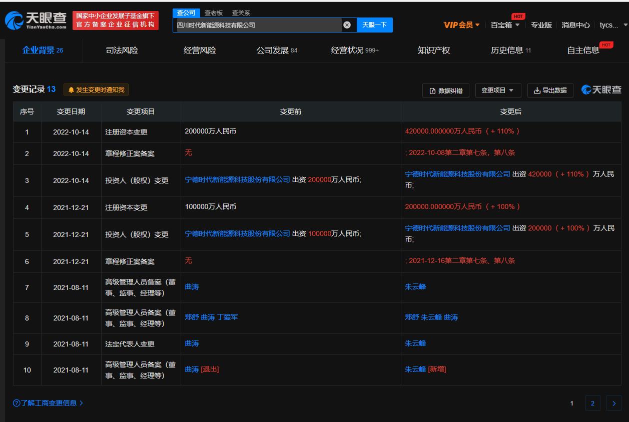 10月17日,天眼查体现,克日,四川期间新能源科技有限公司发生工商变动,注册资源由20亿元人民币增至42亿元,增幅110%。该公司建立于2019年10月,法定代表人朱云峰,由宁德期间新能源科技股份有限公司全资持股。 |
