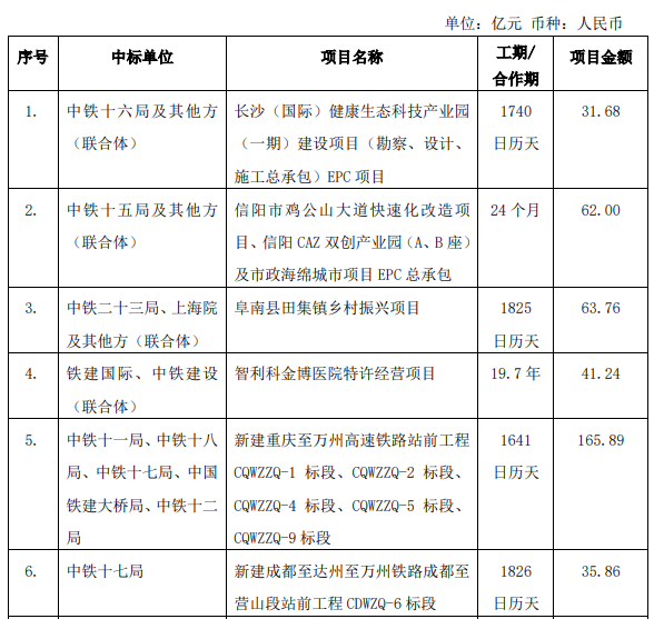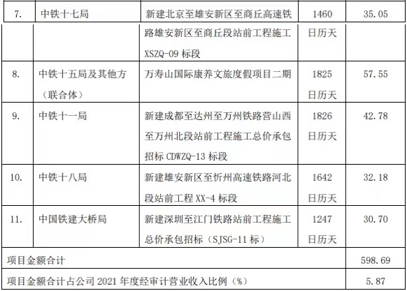 中国铁建10月17日公告,近期,公司中标11个庞大项目,项目金额合计598.69亿元,占公司2021年度经审计业务收入比例5.87%。 |