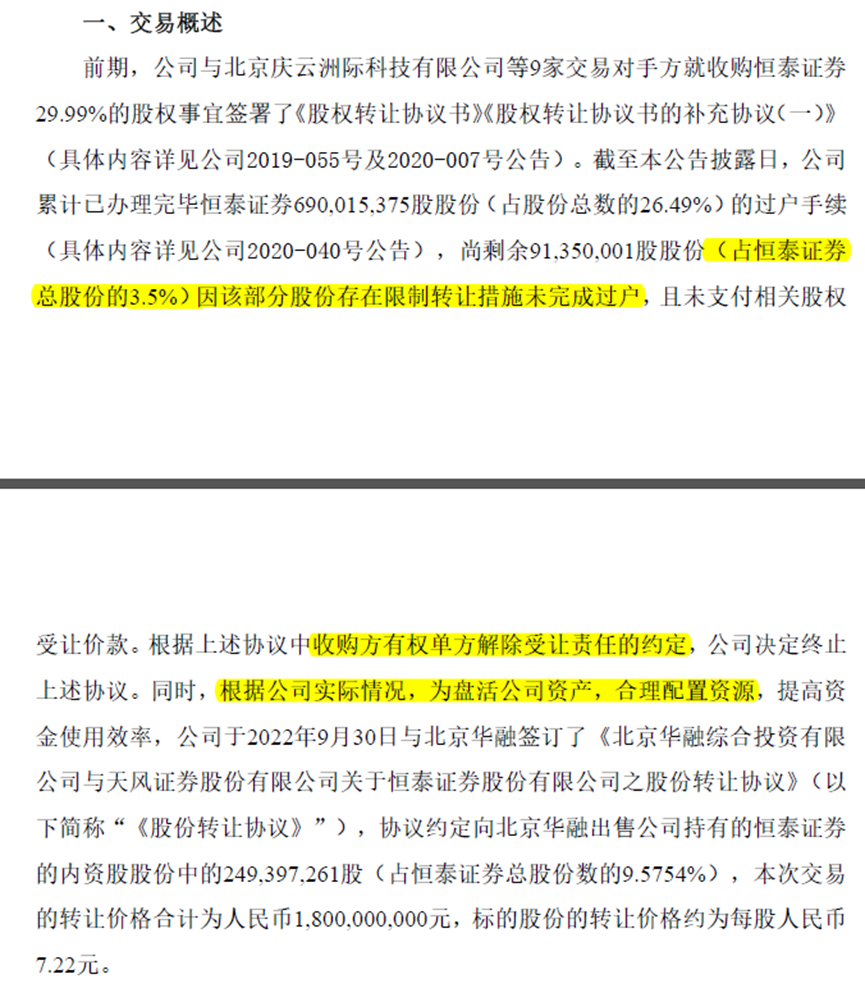 原创首发 | 金角财经 作者 | 塞尔达 留给天风证券的时间不多了。 民营资源“今世系”爆雷前,原为天风证券的实际大股东,多次增资的湖北国资并未干预天风证券的策划管理。 “今世系”爆雷后,天风证券开始“去今世化”,湖北省级金控平台宏泰团体二度增持,成为第一大股东。 然而,“今世系”爆雷对天风证券的负面影响,似乎不是简朴的股权变更就能消除。 本年以来,天风证券已打消多家证券业务部,市场一度推测与代销“今世系”爆雷产物有关。 本年以来天风证券已打消多家业务部 不管是否有关,天风证券的业绩恶化已是究竟。2022年上半年,天风证券业务收入同比下跌30%,扣非净利润暴跌90%,策划现金流净流出凌驾20亿。 这不得不让人担心,湖北国资接盘的,是不是一个烂摊子。 国资接盘 10月12日晚,天风证券发公告称,联发投团体将持有天风证券的5.19亿股以16.77亿元转让给联投团体,再由联投团体将股份无偿划转至宏泰团体。 转让完成后,宏泰团体将直接持有天风证券11.99亿股股份,占总股本的13.84%,成为天风证券第一大股东,而且是惟一持股比例凌驾10%的股东。 宏泰团体二度增持天风证券 宏泰团体由湖北省财务厅100%全资控股,原名湖北省宏泰国有资产运营有限责任公司,2021年依当地当局要求完成资产重组,2022年1月更为现名。 重组后,宏泰团体定位为湖北省属综合金融服务商,也是湖北惟逐一家金融服务类的省属平台企业。 克制客岁末,宏泰团体注册资源80亿元,总资产614.5亿元,共有15家子企业,5家告急非全资子企业。 除天风证券外,宏泰团体还是湖北银行第一大股东、国华人寿第五大股东、航天金租第五大股东、长江证券第七大股东。 2019-2021年,宏泰团体业务收入分别90.79亿、116.68亿、140.63亿,归母净利润分别为-1.17亿、-14.57亿、2.71亿。 宏泰团体财务数据 本年4月,在“今世系”爆雷后,湖北当地当局就对天风证券提出了“去今世化”的要求。 4月1日,天风证券发公告称,“今世系”核心上市公司人福医药将持有天风证券的7.85%股权,以21.24亿对价全部转让给宏泰团体。 宏泰团体以21亿对价收购天风证券7.85%股权 从其时情况看,宏泰团体收购的代价并不高。 公告表现,转让单价为协议签订日(3月31日)收盘价的90%,即3.123元/股。本年一季度,天风证券股价成交均价为3.71元,最高价为4.10元。 也就是说,宏泰团体的初次收购价,相对于此前的成交均价,打了84折。 但是,天风证券的股价并未克制下跌。在协议签订后克制10月17日,天风证券收盘价报2.86元,比宏泰团体初次收购时的代价还低了8.4%。 天风证券股价一连下跌 别的,“今世系”旗下的三特索道、今世团体也已先后通过大宗生意业务转让了天风证券的部门股权。现在“今世系”仅通过今世团体、上海天阖、三特索道合计持有天风证券1.98%的股份。 天风证券的“去今世化”,根本完成。 深陷“今世系”爆雷风波 宏泰团体的入局契机,告急是天风证券原实际大股东“今世系”深陷爆雷风波。 2022年4月,“今世系”多家公司在武汉长江众筹金融生意业务有限公司(下称“长众所”)挂牌发行的自融非标产物先后出现标题,这些非标产物告急通过长众所、“今世系”所控制武汉喆信投资管理有限公司及天风证券员工对外贩卖。 在“今世系”债务危急中,末了确权规模约57亿元,涉及各地投资者近4000人,已由武汉当地当局建立专班,和谐处置惩罚。 值得注意的是,“今世系”在长众所发行的非标产物具有典范的自融特性,发行主体为“今世系”旗下公司,告急被包装成“定向融资操持”、“资产收益权”,底层资产不明白,由今世团体或其关联方兜底。 如武汉嘉合置业有限公司发行的“长嘉81号定向融资操持”,由武汉今世地产开发有限公司负担连带清偿责任;今世明诚足球俱乐部有限公司发行的“明诚(2021)452号产物”,则靠今世团体对产物本金及收益的偿付提供差额补足答应。 除了长众所的非标产物,“今世系”互助私募北京福升投资管理有限公司发行的“天信”、“安心”等固收私募基金产物,在“今世系”债券违约后净值暴跌,底层大量持有“今世系”境表里债券,致使投资者丧失惨重,涉及规模逾7亿元。 这些产物由“今世系”关联公司北京增财基金贩卖有限公司、天风证券代销,与非标产物一样,贩卖过程中今世团体及关联方出具了差额补足函。 别的,据财新报道,天风证券香港子公司天风国际比年来通过天风证券等机构在本地展业,与近百名个人客户签订全权委托账户协议,终极客户的美元资产通过结构化单子与分级基金产物接盘了“今世系”在境外发行的美元债,在今世团体境外美元债违约后,这些产物均丧失惨重。 “今世系”的爆雷,也成为天风证券运气的迁移转变点。 此前,天风证券一度被以为是中小券商“弯道超车”的样板,而“今世系”爆雷后,留给天风证券的,只有一个又一个的烫手芋头。 业绩暴跌九成 本年上半年,只管股票市场在二季度有所反弹,但团体来说行情低迷,这也导致券商的自业务务出现差异程度下滑。 股市行情拖累券商自业务务 自业务务受行情影响,而传统的经纪业务早已是红海市场,缺乏着名度的中小券商日子更欠好过。 2022年上半年,天风证券业务收入排在上市券商的倒数12名,是典范的中小券商。 日子原来就欠好过,还摊上“今世系”爆雷,天风证券算是屋漏偏遇连阴