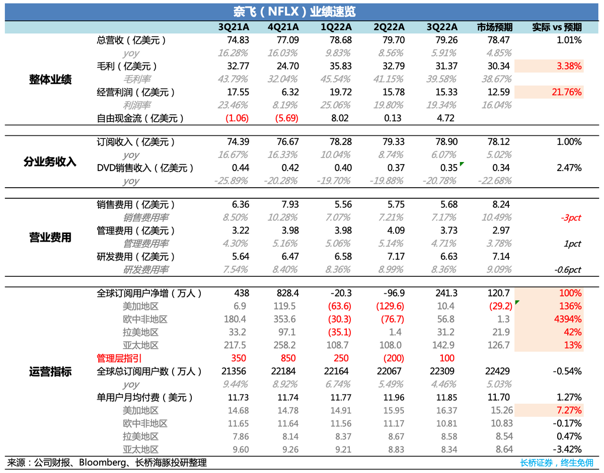奈飞(NFLX.O)北京时间10月19日破晓发布2022年第三季度财报,本来市场预期是比力守旧的,重要是思量到宏观经济以及汇率变动带来的压力。固然这确实当下须要思量的环境因素,但内容行业更多的还是受到内容供给的影响。三季度奈飞的内容供给团体上就非常强劲,不光数目新高,而且创收视记载的爆款也扎堆在这个季度。6月上线的《怪奇物语4》热度效应连续到整个三季度, 9月尾上线的《怪物:杰夫瑞达莫》接棒再次得到超高观看时长,连续不停地优质内容动员奈飞的业绩轻松超预期。 除此之外,由于对广告模式猜测不停比力积极,管理层对四序度的用户增长指引,也比市场的预期要更优一些,不外由于美元升值和部门三季度费用付出延期的影响,四序度的收入和利润指引要逊于市场预期。 具体来看细项指标: 总收入同比增长6%,重要受订阅用户数的增长驱动,尤其是亚太地区,不停在举世用户规模扩张的主力军。但三季度由于优质内容吸粉,西欧等成熟地区回流了一些用户,这是与市场重要的预期差所在。三季度用户净增长240万,比指引和市场预期都要好许多,而且差异于前两个季度指引守旧,此次公司对下季度的用户增长也更乐观一些,预计在11月上线的广告支持服务刺激下,四序度有望得到举世450万的用户净增,超出市场预期。 别的公司提及,由于广告收入即将产生贡献,公司对业绩的关注将更加聚焦于收入性指标,因此从来岁开始将不会再披露关于用户增长的指引数据。 这次利润端体现显着超出公司指引,重要源于部门预算开支延到四序度了,这也导致四序度的利润指引低于市场预期。再加上国际业务受到美元升值的影响,因此整年的谋划利润率水平不及年初定下的目标。 管理层夸大汇率变动的影响对利润带来较高的不确定性,假如剔撤消汇率的影响,四序度的谋划利润率为10%,高于客岁同期水平(~8%)。 海豚君以为,从行业竞争加剧(内容本钱增长、收购重组费用增多)和广告支持服务上线初期(相干推广开支、调解付费模子的费用付出增长)的角度来看,奈飞未来的本钱开支只会多不会少。三季度费用环比低落的环境,并不能代表常态。 三季度自由现金净流入4.72亿,这个季度有付出延缓的影响,预计四序度自由现金流有压力。但奈飞前三个季度累计自由现金流已经到达12.8亿,公司整年10亿的目标应该可以或许告竣。 三季度末公司净负债(现金-是非期债务)为79亿,未来一年没有债务到期。资金使用上,还是优先选择好的标的(游戏、广告类)举行投资收购,超出最低持有比例的现金(约为两个月收入~50亿左右),会通过回购股票来返利于股东。 长桥海豚君观点 本来想直接谈广告支持操持,但三季度财报本身还是有值得聊一聊的,除了由于优质内容而超预期的订阅用户增长外,风趣的是,对“竞争”的表述不停相对佛系的奈飞,一反常态,在股东信首段内容就重点提及了竞争。 在三季度的财报中初次非常直白的披露了本身与竞争对手(Amazon、Disney&Hulu)9月的用户交互数据对比;同时暗示偕行的烧钱动作太快,本年大概率要在流媒体上“巨亏”,而本身已经在康健的红利。 此前海豚君就通过尼尔森数据看到,归功于创下奈飞汗青收视记载的《怪奇物语4》的热播,奈飞的三季度用户活泼数据非常不错,市占率也来到了一个新高水平。 不知道如许的与竞争偕行的数据对比未来还会不会连续披露,但还是得承认只拿8/9月的数据尴尬刁难比,奈飞多少有点占了些自制。但海豚君以为更告急的是,这体现了奈飞对竞争态度的显着变化,包罗提前Disney抢跑广告模式的推进,都在表明管理层对于行业竞争的器重度快速拉高,另一面也反映出竞争剧烈加剧。 而实际上市场最关心的还是奈飞Ad-Supported订阅操持,从二季度电话会上初次睁开形貌广告模式后奈飞的股价至今也反弹了20%。可以说,这段时间重要就是炒的广告操持。 广告操持公司本来是在来岁2023年一季度推出的,但在偕行(Disney)也对外公布将广告套餐提上日程后(操持本年12月推出),作为流媒体年老的奈飞估计也是坐不住了。颠末9月提前吹风,上周公布细节以及公司的短期目标,11月4日将是广告套餐服务的正式上线日期。 靠着原创内容自负不停涨价,走过了10多年刚刚将纯订阅模式走通的流媒体鼻祖,这次的贸易模式厘革,赚足了市场及偕行的关注。 我们都知道,除了亚太地区,奈飞在其他地区的家庭排泄率较高,未来长视频收入的增长重要靠提价,但单纯进步付费门槛,这在经济低迷期涨价轻易引来用户流失的反噬。 而广告模式的推出,实际上是一种变相提价(进步ARPU)的方式,只不外多出的代价由广告主取代用户付了。从Hulu的环境来看,订阅Ad-Supported的用户代价(订阅收入+广告收入),显着高于单纯订阅付费的用户。 不外我们也得思量到当下的广告市场环境,西欧阑珊信号不停增强,广告主的裤腰带大概还将进一步紧缩,大概也会影响到奈飞广告创收的初期效果。与此同时,互联网广告巨头都在转向高效转化的短视频战场,基于中国大陆市场的演进过程,海豚君以为,奈飞未来可以或许分去的市场蛋糕大概重要还是从传统电视、其他长视频平台中分得。 而市场对广告支持模式的效果抱有更高的预期,尤其是可以或许资助奈飞反抗经济环境压力,迈过增长瓶颈,从而镌汰利润保持增长的压力,如许在后续举世经济阑珊全场杀业绩时,奈飞股价可以
