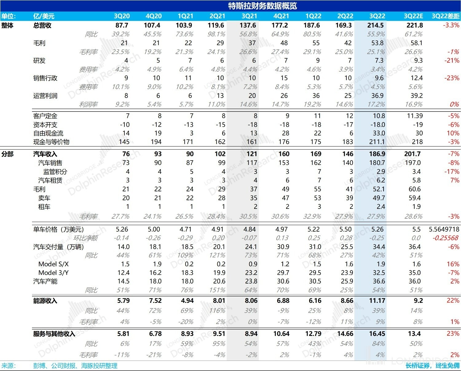 本次$特斯拉.US财报解读海豚君与美投君互助来发视频版本,具体内容随后发布,海豚君此处仅提炼一下焦点信息。 1. 低于预期?原罪在车价:在能源和服务收入、红利都非常不错的环境下,单车代价下行幅度太高,导致特斯拉三季度 214.5 亿的收入终极显着低于预期的 222 亿美金,终极的谋划利润 37 亿美金,比市场预期的 39 亿也少了两个亿。 而过细看的话,利润的标题除了收入的标题,尚有单车经济变差后汽车业务毛利率变差,而费用上则是特别抠门,特别是股权鼓励同比 20%+ 的下滑,让贩卖和研发都维持在低位,根本没什么增长。这次特斯拉表现低于预期,而且低于预期的标题还比力严肃,标题全部出在汽车业务上。 2. 汽车贩卖:先是销量出标题,再是单价、单车经济下滑。十一期间,特斯拉公布汽车销量低于预期,对于缘故因由的明确固然有运输带来的供给标题 vs 订单带来的需求的判断差异,但它已经带着新能源整车惨跌了一波。 而从财报上看到的信息来看,这个季度汽车的单价和单元经济也变得更差了:汽车单价相比二季度降落幅度太快,导致节省出来的单车摊折本钱和单车可变本钱完全无法覆盖掉单车均价的降幅,并导致了单车毛利率的进一步下滑,阔别 30% 的关键分水岭。 这此中除了汇率、车型布局中 Model 3/Y 代价较低的车的占比拉升这种次要标题,更紧张的标题实在指向的是不停以困扰特斯拉的供需抵牾的办理,以及特斯拉汽车售价进一步下滑的大概性。 3、当产能不再瓶颈,特斯拉间隔真贬价尚有多远?上海厂六月尾已经满血复活后,再加上柏林工厂的爬坡,特斯拉产量已经开始蹭蹭上行。特斯拉公布的客户预定金额、第三方跟踪的特斯拉订单余粮量、中国特斯拉快速缩进提车时间等等征象都在指向,特斯拉的产能开释在快速斲丧特斯拉的订单余额,而且特斯拉相比偕行超高的毛利率 + 特斯拉 50% 的年销量目标,也在指向特斯拉贬价好像如饥似渴。 关于汽车业务板块更加细致的分析,后续视频内容。 4、能源和服务 “都挺好”:汽车业务出现标题,但储能和服务业务这个季度都挺好,这个好表如今收入的双双加速上行,也表如今毛利率继承维持转正状态。 尤其是储能之前由于储能半导体短期影响了装机,这个季度这个标题的影响已经变小,而且服务业务上,超充业务的订价战略调解,二手车业务也不错,增长非常可喜。 只是这两个业务根本都在 “婴儿” 状态,占比着实太少,再好也无法补充汽车业务出现的标题。 海豚君团体观点:当特斯拉卖车业务需求演变为紧张抵牾,新能源整车市场真正的混战要来了! 上季度海豚君还在说特斯拉固然业绩平平,但信奉不破,标题办理的关键是在产能。但如今产能没标题了,标题渐渐往需求转移的时间,特斯拉的逻辑大概立刻就要有庞大变化,这里有两个要思考的关键标题: 1)贬价还远吗?特斯拉之前不停的标题是订单太多,产能不敷,如今上海厂的产能从 2021 年底的 50 多万辆、到 22 年初的 75 万辆,再到年底的 100-120 万辆,而且国内其他车厂也都在大量开释产能,特斯拉中国国内已无供需抵牾的环境下,国内特斯拉贬价根本箭在弦上;同时,欧洲等外洋(不含北美)的市场要消化更多的特斯拉中国产能,而欧洲整个新能源市场 7、8 月份销量并不算好。特斯拉作为举世当前毫无争议的新能源龙头,举世高息环境压抑可选斲丧的环境下,特斯拉从高价中下探,肯定对应着举世市场的混战。 2)毛利率守得住吗?美元如果连续高位腐蚀特斯拉造车红利本领,再加上特斯拉中国产汽车贬价的话,特斯拉可否守得住毛利率是一个值得须要认真探究的标题,至少从三季度的环境来看,风险值得器重:毕竟单车下行太快,当原质料本钱又无法同步下行的时间,单靠固定本钱折旧降落,压力会比力大。 团体上,海豚君以为当混战到临、了局清楚之前,对于特斯拉的投资大概躲为上策:固然,在混战时候特斯拉有傲视群雄的资源——超高的汽车代价带和毛利率,打起代价战来得心应手,市场偕行压力会更大。 但这会特斯拉来说,短期很大概意味着毛利率的下滑,市场须要重新调解长线销量和毛利率预期,没有更清楚的指引和几个季度的数据验证之前,特斯拉的财政确定性在降落,当中陪同代价下行并不奇怪。 以下是电话会内容正文: 一、管理层陈诉: 1.1 三季度谋划环境: 产能环境:柏林工厂已实现每周 2000 辆的产能,德州奥斯汀工厂也将很快实现每周 2000 辆的产能; 4680 电芯:产能较上季度翻了 3 倍,第二代 4680 电芯在奥斯汀工厂生产,而 22 年 Q3 加州弗里蒙特工厂的产能到达了新记载并保持增长。公司 4680 电芯生产在 Q3 希望顺遂,颠末前期的摆设,预计很快将产能进步到新的水平。在生产过程中,公司在思量怎样用新一代生产装备支持 4680 电芯的生产,渴望未来的动力体系可以大概与 4680 电芯实现更好的整合。 FSD Beta:公司在 FSD Beta 上方面取得了不错的希望,在 Dojo 超算方面,通过进一步发展实现更好的结果,为 FSD 软件提供更多特性。公司在 Ai 与 FSD 各方面均须要更多人才,渴望从举世招募更多顶尖的专家。本季度非常多用户加入了 FSD Beta,更多可用的数据将不绝改善体系与软件,使得车辆在差异工作模式下都可以为用户带来更好的体验。 需求方面:如今公司团体需求强劲,当前总体运营状态精良,举世数座工厂全速运转,只管此前上海工厂由于疫情缘故因由产能受到极