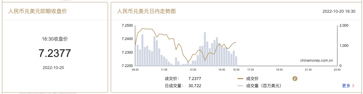 来自中国外汇生意业务中央的数据表现,2022年10月20日,在岸人民币兑美元16:30收盘报7.2377,较上一生意业务日跌135个基点。 |