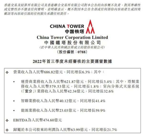 10月20日,中国铁塔克日发布2022年前三季度未经考核的重要运营数据。 2022年首三季度,中国铁塔业务收入实现686.82亿元,同比增长6.3%;归属于公司股东的利润为63.99亿元,同比增长21.7%。 期内,中国铁塔运营商业务收入实现621.87亿元,同比增长3.4%;智联业务收入实现40.12亿元,同比增长41.4%;能源业务收入实现23.03亿元,同比增长 59.9%。两翼业务收入占业务收入比重由客岁同期的6.6%提拔到9.2%。 制止2022年9月30日,中国铁塔塔类站址数到达205.2万个,塔类租户数到达353.5万户,较上年末净增7.6万户。塔类站均租户为1.72户。 中国铁塔体现,运营商业务方面,进一步打造“5G+室分”双增长引擎,巩固公司在通讯底子办法建立运营市场的主导职位,驱动运营商业务妥当发展;智联业务 方面,深化“通讯塔”向“数字塔”的升级,提拔铁塔视联平台本领,支持智联业务高速优质发展;能源业务方面,聚焦“铁塔换电、铁塔备电”,推动产物升级,助力能源业务规模快速增长。 |