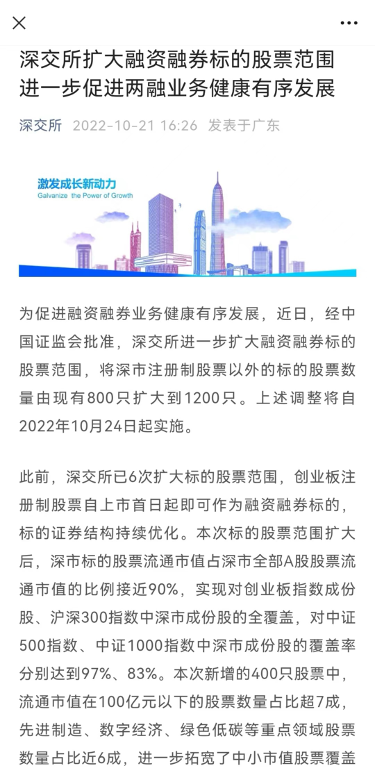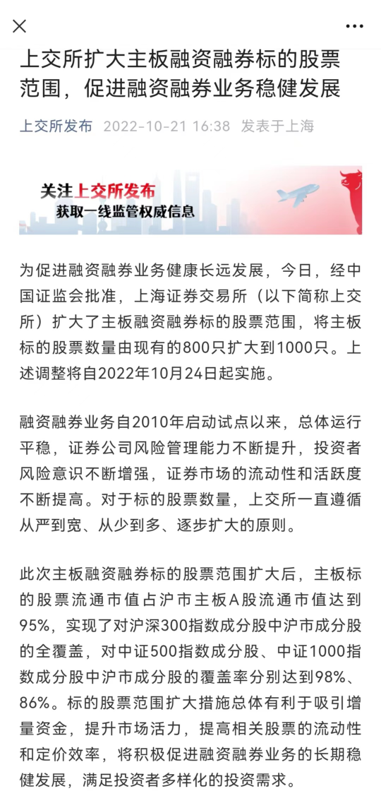 中国基金报记者 李树超 10月21日,沪厚交易业务所分别发布公告称,为促进融资融券业务康健长远发展,克日,经中国证监会允许,沪深两所分别扩大了融资融券标的股票范围,对于主板股票和创业板注册制改革前上市的创业板股票,标的数量由1600只扩大至2200只,扩容幅度达38%。上述调解将自2022年10月24日(下周一)起实验。 多位业内人士对此表现,此次沪深两市两融标的扩容600只个股,有利于进一步满足市场多元化需求,加强两融标的的覆盖面和代表性,新增的先辈制造、数字经济、绿色低碳等国家重点支持范畴,也有利于引导市场资源重点设置。同时,两融标的大幅扩容,有利于进步新增标的股票的订价服从和活动性,从中恒久角度看,尚有利于吸引增量资金入市,引发市场活力,对资源市场形发展期利好。 新增600只!两融标的大扩容 覆盖面和代表性进一步增长 10月21日,上交所发布公告称,为促进融资融券业务康健长远发展,经中国证监会允许,上海证券交易业务所扩大了主板融资融券标的股票范围,将主板标的股票数量由现有的800只扩大到1000只。 同一天,厚交所也发布公告进一步扩大融资融券标的股票范围,将深市注册制股票以外的标的股票数量由现有800只扩大到1200只。 据悉,如今除注册制股票上市首日纳入融资融券标的证券范围外,此次扩上将进一步增长标的股票的覆盖面和代表性。 根据9月末数据,沪市由800只扩大至1000只,扩大后标的股票数量占沪市主板上市公司的数量占比,将由48%进步至60%;标的股票流畅市值占比将由89%进步至95%。深市由800只扩大至1200只,主板股票及创业板注册制改革前上市的创业板股票中,标的股票的数量占比将由35%进步至52%,标的股票的流畅市值占比将由76%进步至88%。 同时,本次标的股票扩大,实现了两融标的股票对沪深300指数和创业板指数成份股的全覆盖,大大进步了对中证500指数和中证1000指数成份股的覆盖率,副黄?的股票的数量占比分别从92%、61%上升至98%、85%。 本次标的股票扩大,还将纳入更多先辈制造、数字经济、绿色低碳等重点范畴上市公司股票,有利于发挥两融资金促进代价发现、提供活动性等根本市场功能,更好满足投资者交易业务需求。 谈及此次两融标的扩容,多位业内人士表现,标的证券的扩大,将有利于进一步满足市场需求,促进融资融券业务和资源市场恒久妥当发展。 国泰君安证券名誉业务委员会总裁陈煜涛表现,沪厚交易业务所融资融券标的证券扩容,有利于满足投资者分散化、多元化投资需求,促进业务妥当发展,同时助力资源市场高质量发展。 陈煜涛分析,一是两融标的扩容后,名誉账户可交易业务标的范围扩大,两融战略工具运用场景随之扩大,有利于更好满足投资者分散化、多元化交易业务需求,提拔二级市场交易业务战略容量。 第二,从主板过往6次标的扩容来看,标的扩容短期不会改变市场发展趋势,但在市场团体向好时,具有市场放大器效用,投资者选择范围更多,增量资金的叠加效用有助于促进业务妥当发展,加强市场信心。 末了,此次扩容实现了对创业板指数成份股、沪深300指数中深市成份股的全覆盖,以及对中证500指数、中证1000指数较高的覆盖率,助力100亿市值以下中小上市公司和先辈制造、数字经济、绿色低碳等重点范畴的创新公司,有利于吸引专业投资者群体,发掘更好的投资机遇,助力经济布局转型和资源市场高质量发展。 北京一位公募人士也表现,如今重新增标的看,很多股票属于先辈制造、数字经济、绿色低碳等重点范畴,将有利于拓宽中小市值股票覆盖面,推动市场资源设置到国家重点支持范畴,这有利于加强两融标的的行业代表性和市场代表性。 一位靠近羁系的业内人士也表现,比年来,随着证券市场不停发展,市场对于扩大标的范围的呼声较高,盼望放宽标的证券数量限定,满足投资者多元化的投资需求。此次新增沪深两市标的股票数量较大,合计600只,是交易业务地点继续遵照两融标的管理原则的根本上,积极回应市场诉求的效果。 进步订价服从和活动性 有望吸引增量资金入市 多位业内人士解读,沪深两市两融标的大扩容,有利于进步新增标的股票的订价服从和活动性,从中恒久角度看,有利于吸引增量资金积极入市,对资源市场形发展期利好。 在陈煜涛看来,两融标的扩容后,一方面将进步新增扩容标的证券的活动性,标的生动度有望进一步提拔,尤此中证500、中证1000等中小市值股票的交易业务生动度将进一步提拔。 另一方面,标的扩容将显着提拔资金利用服从,增长市场活动性,在市场订价服从进步、颠簸更趋安稳的预期下,投资者到场市场信心加强,投资举动也将更为理性,进一步吸引增量资金入市投资。 上交所官网表现,标的股票范围扩大步伐总体有利于吸引增量资金,提拔市场活力,进步干系股票的活动性和订价服从,将积极促进融资融券业务的恒久妥当发展,满足投资者多样化的投资需求。 厚交所也表现,融资融券是紧张的证券交易业务根本性制度,自2010年试点开展至今,总体运行安稳,证券公司风险管理本领有用提拔,投资者风险意识日益加强。本次标的股票范围扩大,有利于发挥融资融券促进代价发现、进步标的证券活动性的积极作用,进一步满足投资者多元化投资需求。 据悉,融资融券业务自2010年启动以来,沪深两所根据干系规定,遵照从严到宽、从少到多、渐渐扩大的原