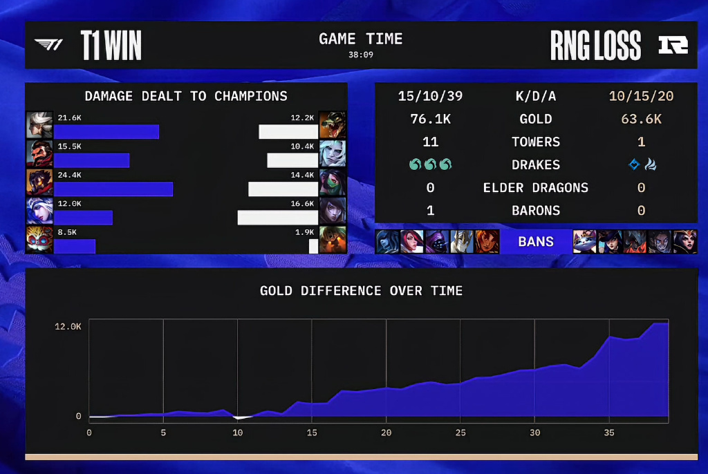 S12天下赛8强赛RNG和T1的比赛,终极T1以3-0的战绩横扫RNG,晋级4强,半决赛的对手将是JDG,而RNG本年天下赛止步8强。 第一局T1上单青钢影,打野男枪,中单维克托,下路艾希加大头;RNG上单鳄鱼,打野佛耶戈,中单阿卡丽,下路厄斐琉斯加泰坦。10分钟两边夺取峡谷先锋,RNG率先开团击杀Zeus青钢影,打出了一波1换4,但是oner男枪拿下了峡谷先锋。11分钟T1在上路抓死Breathe呼吸,推掉了上路一血塔。前期T1经济领先2K。中期23分钟,T1使用Zeus青钢影41分带,推掉了RNG上路高地塔。后期31分钟,T1拿下了第一条大龙。37分钟T1在高地击杀RNG四人后,一波竣事了比赛。 第二局RNG上单剑姬,打野猪妹,中单塞拉斯,下路卡莎加泰坦;T1上单杰斯,打野佛耶戈,中单阿卡丽,下路霞加烈娜塔。2分钟wei猪妹抓上,击杀了Zeus杰斯,RNG拿下了一血。6分钟oner佛耶戈抓上,没能击杀breathe剑姬,wei猪妹赶来反打乐成击杀T1上野两人。15分钟T1推掉了下路一血塔。RNG前期经济领先2K。中期18分钟Breathe剑姬在上路单杀zeus杰斯。25分钟RNG拿下了听牌龙。后期31分钟RNG拿下了风龙魂,但是T1偷下了第一条大龙。37分钟两边夺取太古龙,RNG开Gumayusi霞失败,T1反打乐成打出一波2换4,随后拿下了太古龙和第二条大龙。40分钟小虎偷蓝buff,但是被T1抓死,T1直接推上高地,在高地团灭RNG,T1翻盘拿下第二局。 第三局RNG上单剑魔,打野蔚,中单塞拉斯,下路厄斐琉斯加奶妈;T1上单永恩,打野猪妹,中单阿卡丽,下路韦鲁斯加塔姆。6分钟breathe剑魔抓中,击杀了oner猪妹,Breathe剑魔拿到了一血,随后小虎贪兵被抓死,T1下路增援过来,换掉RNG三人。之后RNG在下路和上路防gank的时间,都打出了人头的互换。13分钟,T1又一次抓死Breathe剑魔后,推掉了上路一血塔。15分钟两边夺取峡谷先锋,Keria塔姆开团,T1打出一波1换3后,拿下了第二个峡谷先锋。前期T1经济领先4K。中期20分钟T1推掉了RNG中路一塔后,直接开团,越二塔团灭RNG。22分钟Zeus永恩在野区单杀小虎塞拉斯,不外本身也被gala厄斐琉斯换掉。23分钟T1在上路打出一波1换3后,拿下第一条大龙。终极26分钟,T1在高地团灭RNG后,一波竣事了比赛。 那么,对于这场比赛,你们有什么想说的吗?接待在品评区留言探究。 |
