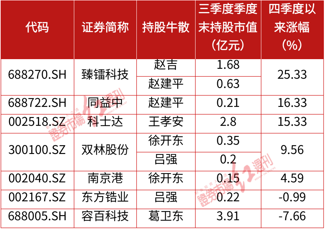 红周刊 本刊编辑部 | 刘增禄 A股上市企业的大股东名单中,除了公私募基金、QFII、陆股通等国表里机构资金气力外,牛散们同样是“常客”,他们反复总能依附着本身独特且敏锐的市场嗅觉精准匿伏,押中牛股,成为驰骋于资源市场中的超等散户。 克日,随着上市A股三季报的披露,牛散们的最新持仓已徐徐被揭开面纱,赵建平的臻镭科技、同益中;王孝安的科士达;徐开东的双林股份等重仓股,均在各位牛散大佬买进后股价走出了凌厉的上涨行情,不停放大着大佬们的持股身价。 牛散重仓股四序度涨多跌少 10月10日,A股上市公司三季报披露正式开启,停止10月22日,完成披露的公司已合计211家。 翻看各公司三季度末的最新大股东持仓情况,超等牛散们的身影已连续显现,赵建平继续持有同益中的同时,携其女赵吉已一连三个季度重仓臻镭科技。 徐开东、吕强各自完成对南京港、东方锆业的重仓后,还一同出如今了双林股份最新一季的大股东阵营。 而发家于期货的葛卫东与王孝安,现在也已相继于容百科技、科士达的大股东名单中现身(见表1)。 表1:已现身的超等牛散三季度最新持股 只管当前三季报披露比重尚轻,各位牛散大佬的最新持仓情况还仅是“冰山一角”,但联合持股市值可以看到,多位大佬们对单只个股的重仓规模即凌驾了亿元,如葛卫东本年三季度新进的容百科技,季度末持股市值3.91亿元;王孝安继续持有的科士达,三季度末持股市值为2.8亿元;“牛散二代”赵吉对臻镭科技三季度末的持仓市值也高达1.68亿元。随任意便就是“一个或几个小目的”的投入。 而假如四序度以来各位牛散们对上述重仓公司的持股没有厘革,则臻镭科技、同益中、科士达、双林股份、南京港仍在继续为其股东们创造收益,尤其本年刚刚登岸科创板的臻镭科技,10月以来,10个生意业务日的累计涨幅已达25.33%,10月21日盘中,乐成创出了131.6元的汗青新高(见图1)。 图1:臻镭科技走势图 数据泉源:大聪明 牛散二代赵吉一只重仓股暴赚超1亿 联合数据统计发现,赵氏父女对臻镭科技可谓高度青睐。自公司年初登岸资源市场以来,一季度末首个陈诉期的前十大流通股东中即出现了赵吉、赵建平的身影,分别以160万股、35万股的持仓位居第二位和第八位,持股市值为1.06亿元和0.23亿元。 颠末了三个陈诉期的持有,赵吉的持股数不绝未变,赵建平则是在二季度期间完成了一次加仓活动,将持股数增至60万股,而最新的三季报数据表现,三季度末,赵建平也继续保持了60万股的持仓。 同时涉及航天军工、北斗导航、芯片等多重概念,臻镭科技自上市以来股价不绝保持着妥当的震荡攀升趋势,在市场团体表现疲软的同时,上市不到一年时间,股价已乐成完成了翻倍上涨,累计涨幅达135.36%。 而随之而来的无疑是股东持股身价的水涨船高,三季度末,赵吉、赵建平对臻镭科技的持股市值已达1.68亿元和0.63亿元。而假如四序度以来二位对臻镭科技未实行减持,则最新持股市值将进一步增至2.11亿元和0.79亿元。短短两个季度,赵吉仅此一只重仓股的红利就实现了近1.05亿元。赵建平也同样实现了数万万的浮盈。 不但对臻镭科技的重仓使得父女二人赚得钵满盆满,统计发现,赵建平已一连两个季度对同样涉及航天军工题材的同益中发起了重仓。两个陈诉期始终保持着120万股的持仓。 观察公司二级市场走势,自2021年10月份登岸科创板后,公司股价先是走出了一波先抑后扬的趋势,但自2021年11月尾开始即步入了调解,直到本年4月25日,盘中创出了10元的新低后重新步入了上行行情。 而值得关注的是,赵建平对公司的参与时间恰幸亏本年二季度,由此推测,其很大概是在公司回调的过程中完成了抄底建仓,以后公司即乐成走出了一轮翻倍上涨的行情(见图2)。 图2:同益中走势图 期货第一人王孝安10天斩获4300万收益 赵氏父女重仓股一连大涨的同时,曾被誉为中国期货第一人的老牌牛散王孝安的持股收益也在快速放大。 翻看汗青数据,王孝安于2021年三季度即完成了对新能源概念股科士达的重仓,但履历了2021年6月初至8月月朔轮逾200%的大涨后,科士达调转方向开始调解,今后前最高近40元左右的股价,一起调解至14元左右,直到本年4月27日,公司才再一次开启了强势上攻模式,至今已经斩获了近3倍的涨幅(见图3)。 图3:科士达走势图 可以看到,本年一二季度,王孝安在公司股价回撤期间,一连两个陈诉期对其举行了减持,从2021年三季报的908.76万股的持仓降至611.39万股,但颠末以后股价的大涨,王孝安固然低落了对科士达的持股体量,持股规模却增长显着。停止三季度末,王孝安的持仓市值为2.8亿元,持仓股数与二季度末类似,均为611.39万股,但相较于较二季度末的1.87亿元持仓市值增长了9300万元。而假如王孝安尚未落袋为安,以最新股价统计,其对科士达的持股市值将升至3.23亿元,10个生意业务日即将实现约4300万元的浮盈。 同为资深牛散,徐开东和吕强则同对双林股份产生了“爱好”,但从择时的角度来看,徐开东的参与时间显着要优于吕强。统计表现,徐开东是在双林股份股价翻倍拉升前的2021年中期对公司完成了初次建仓。吕强近来一次一连持有双林股份的起始时间则是在本年中期。但自此至今,公司股价表现不绝颇为平庸(见图4)。 图4:双林股份走势 通过汗青持仓数据来看,早在2018年年度,吕强即于双林股份的前十大流通股东名单中出现过,