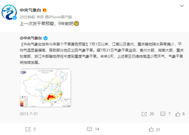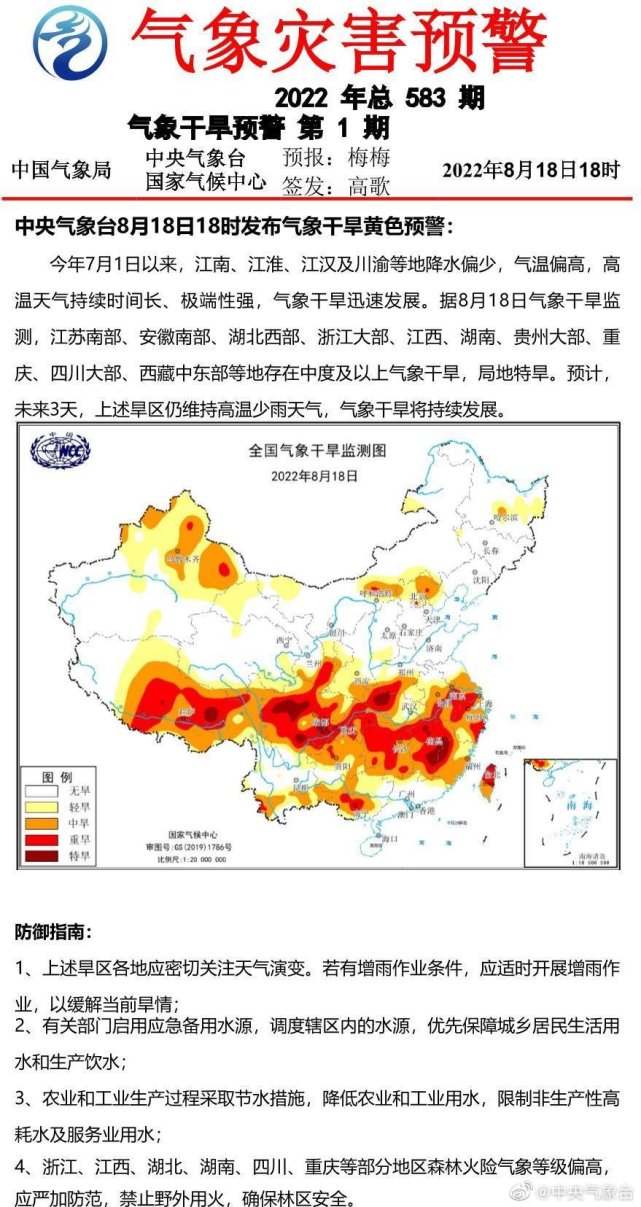 财联社8月18日讯,中央景象台18日18时发背景象干旱黄色预警:本年7月1日以来,江南、江淮、江汉及川渝等地降水偏少,气温偏高,高温气候一连时间长、非常性强,景象干旱敏捷发展。据8月18日景象干旱监测,江苏南部、安徽南部、湖北西部、浙江大部、江西、湖南、贵州大部、重庆、四川大部、西藏中东部等地存在中度及以上景象干旱,局地特旱。预计未来3天,上述旱区仍维持高温少雨气候,景象干旱将一连发展。这也是本年来中央景象台发布的首个干旱预警。 据中央景象台官方微博,上一次发干旱黄色预警是在9年前的2013年7月31日。 值得一提的是,近期受一连的高温少雨气候影响,长江流域旱情发展敏捷,引发较高关注。据水利部昨日在消息发布会上透露,长江流域发生了1961年以来最严峻的景象干旱。四川、重庆、湖北、湖南、江西、安徽6省(市)耕地受旱面积1232万亩,83万人、16万头大牲口因旱供水受到影响。 水利部信息中央副主任刘志雨分析,这次长江流域的旱情重要有以下4个特点: 一是降水汗青同期最少,高温少雨日数多。7月以来,长江流域降水较常年同期偏少4.5成,为1961年以来汗青同期最少。流域大部地域高温日数凌驾20天,中卑鄙地域凌驾30天,部门县一连少雨日凌驾20天,此中湖南局地一连少雨日凌驾40天。 二是江河来水显着偏少,水位一连走低。7月以来,长江干支流来水量较常年同期偏少2—8成,上中游来水量为1949年以来同期最少,长江三峡、汉江丹江口重点水库来水分别偏少4成多、近7成。洞庭湖、鄱阳湖相继于8月4日、6日低于枯水位,分别为1971年、1951年以来最早。当前,长江干流及洞庭湖和鄱阳湖(简称“两湖”)水位较常年同期偏低4.85—6.13米,沙市以下江段及两湖水位为汗青同期最低,洞庭湖和鄱阳湖水面面积较6月缩小3/4。 三是水库蓄水总量靠近常年,部门中小水库蓄水严峻偏少。当前,四川、重庆、安徽水库蓄水较常年同期偏少1成,有70座中小型水库低于死水位,110座靠近死水位运行。 四是大部地域土壤缺墒,四川重庆侧重。当前,流域大部地域土壤轻度以上缺墒,此中四川、重庆、安徽、湖北、湖南、江西6省(市)1/3县区土壤中度以上缺墒,1/10县区土壤重度缺墒。 刘志雨预计,8月尾前,长江流域降水、来水总体仍将偏少,预测9月份中卑鄙大部地域降水来水仍大概继承偏少,安徽、湖北、湖南、江西等地干旱情势大概进一步发展,长江上游水库群蓄水形势严厉。 |