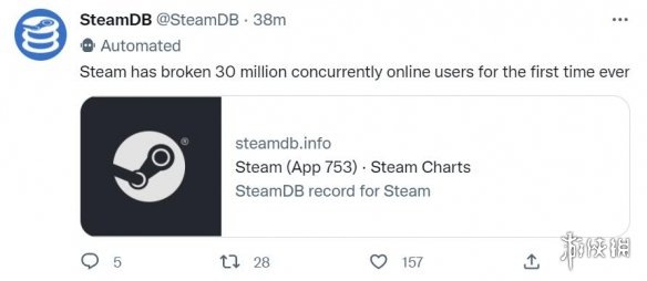 汗青性的一刻!就在刚才,环球有凌驾3000万名用户在同一时间都开启着Steam平台,Steam的“当前在线人数”初次突破了3000万! 现在在Steam平台统计数据页面中可以看到,当前在线的Steam人数为30,005,974。根据Steamdb数据统计,这是Steam汗青上第一次告竣3000万同时在线的效果。 现在Steam“最热玩游戏”Top5为:CSGO、Dota2、PUBG、Apex好汉、失落的方舟 近期有不少热门新游戏都刚刚在Steam推出,好比COD19、女神异闻录5、足球司理23、秘密海疆盗贼合辑、第一个继承者、哥谭骑士等。而《Dota2》的Ti电角逐事也正在举行中,通过Steam平台可以观看角逐直播。诸多因素让Steam的热度得以再创新高。 |