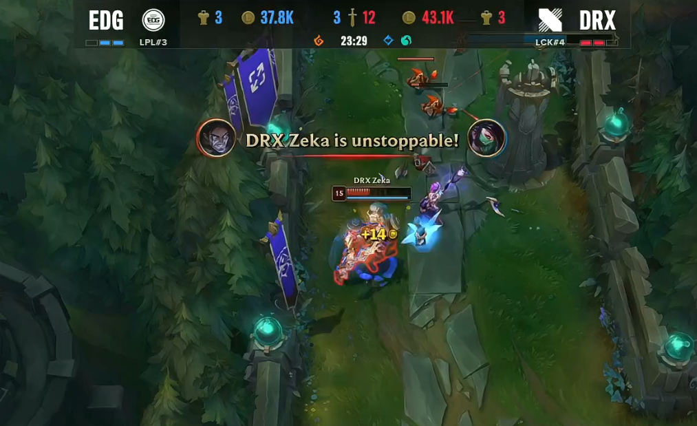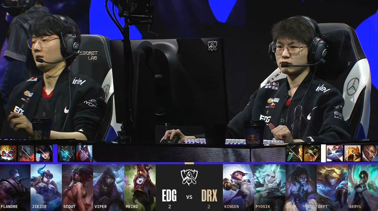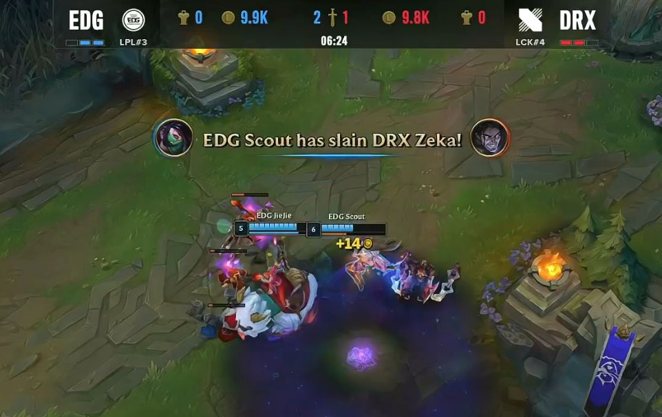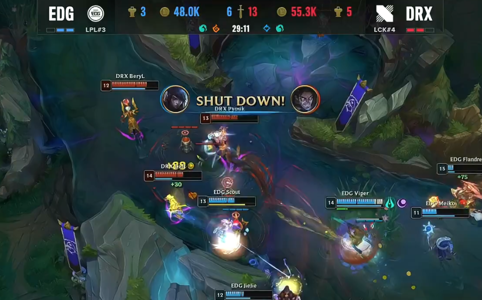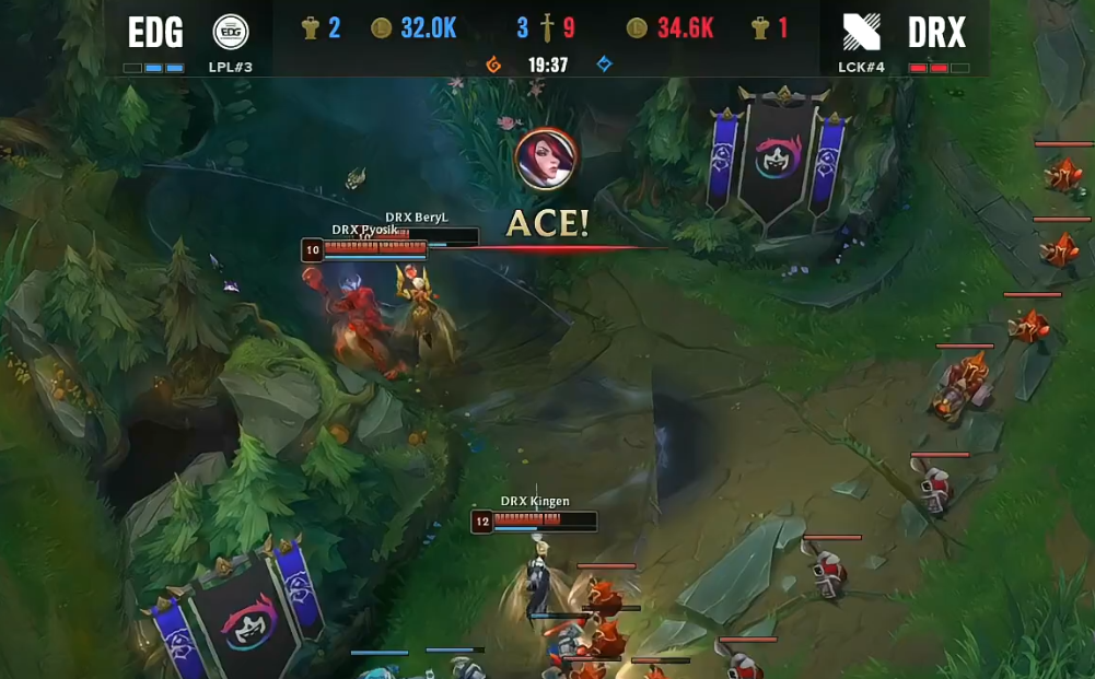 北京时间2022年10月24日,S12环球总决赛迎来了EDG与DRX的八强赛Bo5对决。以下是这一轮Bo5决胜局的战报! 两边BP EDG:武器大家、猪妹、阿卡丽、厄斐琉斯、璐璐 DRX:剑姬、佛耶戈、塞拉斯、EZ、卡尔玛 比赛刚开始没多久,中路发作1V1大战。不外惋惜的是,Scout的阿卡丽由于品级低能量不敷并没有可以大概完成“单杀”,反倒是被Zeka的塞拉斯完成了反“单杀”。不外,随后EDG在上路抓到机遇,乐成“击杀”掉了Pyosik的佛耶戈,之后Jiejie又在中路抓到机遇,共同Scout的阿卡丽乐成“击杀”掉了Zeka的塞拉斯。 比赛时间9分钟左右,EDG双人路压线太深被DRX抓到了机遇,DRX完成了对EDG双人路的“击杀”。比赛时间17分钟左右,两边中路再次举行1V1的对决,而这一次仍然是Zeka的塞拉斯完成了对Scout阿卡丽的“单杀”。比赛时间18分钟,EDG与DRX在小龙处发作5V5团战。固然EDG率先“击杀”掉了没有闪现的EZ,但由于阵容已经乱了,反倒被DRX乐成反打,DRX打出了1换5的团战。 21分钟,Zeka与Scout再次上演1V1对决。但究竟Zeka塞拉斯已经14级,而Scout的阿卡丽才12级,Scout的阿卡丽再次被Zeka完成“单杀”;随后,Zeka再次在上路抓到机遇,又一次完成了对Scout阿卡丽的“单杀”,EDG陷入大劣势。 26分钟左右,EDG抓到BeryL落单的机遇并完成“击杀”,在人数上风的环境下,EDG乐成拿下小龙。随后,DRX在EDG野区抓到机遇乐成“击杀”掉了Jiejie的猪妹,但幸好Viper在这波团战中闪现向前打出爆炸伤害,“击杀”了Pyosik的佛耶戈,同时也打退了DRX。28分钟,DRX使用时间差拿下大龙。不外随后赶来的EDG则是乐成留下了Zeka,Viper拿到了Zeka的“大人头”。 依附着大龙Buff,DRX继续扩大经济上风。 37分钟左右,EDG抓到机遇“击杀”了Kingen的剑姬,随后5人聚集小龙,但没想到的是,依附着4个人,DRX抢下小龙,拿到水龙龙魂,更是完成了一波4打5的团战。在这波团战之后,DRX一波带走了EDG,拿到了末了的胜利,晋级四强。EDG则遗憾止步八强! |