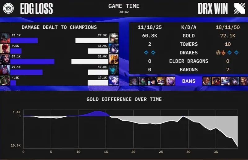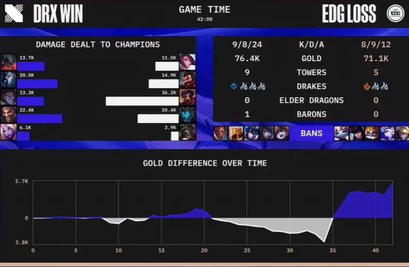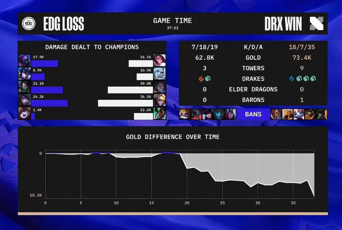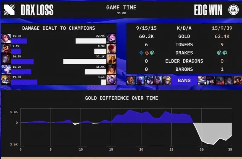 好汉同盟S12环球总决赛八强战中,JDG轻松晋级四强,RNG止步八强之后。LPL赛区晋级的压力,就交给了EDG。他们将在八强战的末了一天登场,面临拥有老队友Deft,LCK赛区的DRX战队。 国电EDG身为S11的冠军,S12的卫冕冠军,他们在对阵DRX之前,全员中标。囧王者唯一担心的是,全员中标的EDG,比赛被耽搁后,他们在后几局的比赛中,留意力和利用是不是会断崖式下滑。 那么在比赛中,他们会打出什么样精彩的对局,7的意志会继承庇佑EDG晋级四强吗? 史诗级翻盘!惋惜,是DRX的让二追三!EDG和DRX的这场比赛,之以是备受关注。不光仅是由于是有队友拘束,更是关系到LPL和LCK两大赛区晋级四强战队数量。在率先竣事的三场比赛中,JDG镌汰RGE起首晋级,RNG随后不敌T1,再次止步八强;GENG鏖战五局,击败DK晋级。至此四强中,LPL一支队伍,LCK两支队伍。如果EDG晋级四强的话,那么LPL和LCK两大赛区,将捉对厮杀。比赛将变得更加故意思起来! 第一局比赛,DRX蓝色方,禁用卢锡安,瑞兹,猪妹,韦鲁斯,伊泽瑞尔,选用Kingen剑姬、Pyosik男枪、Zeka发条、Deft艾希、BeryL大头;EDG赤色方,禁用猫咪,女警,剑魔,塞拉斯,维克托,选用Flandre凯南、Jiejie盲僧、Scout沙皇、Viper希维尔、Meiko奶妈。 EDG和DRX两支队伍,在第一局比赛中,打得比力审慎。双方在前15分内相互摸索,并没有太多的团战和夺取,经济也出现出典范的瓜代领先的情况。15分钟左右的峡谷前锋团战中,DRX完成一波1换2团战后,DRX在随后的15分钟内,借机打出了近2K的经济上风。经济落伍的EDG,坚强的将比赛拖到了后期,25分钟左右的小龙团,沙皇进场开团,EDG完成一波1换5完善团战,并顺势斩获大龙,完成逆转,随后比赛进入EDG时间,35分钟左右,DRX先行减员后,EDG一波闭幕比赛,先赢一局! 第二局比赛,DRX蓝色方,禁用卢锡安,剑姬,鳄鱼,卡莎,奶妈,选用Kingen剑魔、Pyosik波比、Zeka阿卡丽、Deft伊泽瑞尔、BeryL大头;EDG赤色方,禁用猫咪,女警,大树,艾希,金克丝,选用Flandre武器各人、Jiejie猪妹、Scout沙皇、Viper厄斐琉斯、Meiko璐璐。 相较于第一局的反复夺取,双方第二局更像是DRX一面倒的,带引号的“碾压局”。之以是囧王者要带引号,紧张是由于除了前10分的对线期之外,DRX整场比赛都处于片面领先的情况,以致在35分钟左右,经济差高达10K。但DRX在这么高经济上风的情况下,缺乏有用的闭幕比赛的本领,就连偷家无法闭幕EDG。终极让EDG将比赛拖到42分27秒,才完成精彩的绝境翻盘! 第三局比赛,DRX蓝色方,禁用卢锡安,沙皇,猪妹,厄斐琉斯,璐璐,选用Kingen剑魔、Pyosik千珏、Zeka塞拉斯、Deft德莱文、BeryL奶妈;EDG赤色方,禁用猫咪,女警,大头,寒冰,伊泽瑞尔,选用Flandre剑姬、Jiejie男枪、Scout维克托、Viper滑板鞋、Meiko烈娜塔。 当全部人,都以为手握三个赛点,且将比赛拖到了7点钟的EDG,会轻松拿下比赛的。惋惜,通常会事与愿违。第三局比赛中,双方夺取得更加剧烈。在长达43分钟的比赛内里,上风几经转手。EDG打了35分钟的好局,一度经济领先近4K。惋惜的是34分钟左右,DRX迎来了转机,EDG强推无果后,DRX顺势反打完成一波0换3团战,并斩获大龙,瞬间逆转经济,随后顺风顺水翻盘乐成。 第四局比赛,EDG蓝色方,禁用塞拉斯,阿卡丽,女警,大头,奶妈,选用Flandre剑魔、Jiejie盲僧、Scout妖姬、Viper韦鲁斯、Meiko烈娜塔;DRX赤色方,禁用卢锡安,维克托,猫咪,厄斐琉斯,德莱文,选用Kingen青钢影、Pyosik猪妹、Zeka沙皇、Deft滑板鞋、BeryL艾希。 扳回一局的DRX,在第四局比赛中打得更加自动。而反观EDG则是被囧王者猜中,全员中标的他们,在比赛后几局中,留意力和利用显着较前两局出现了大幅度的降落。终极第四局,也被DRX轻松拿下。至此,战歌在本次天下赛第二次响起,EDG和DRX进入决胜局。 决胜局,EDG蓝色方,禁用大头,剑魔,女警,滑板鞋,韦鲁斯,选用Flandre武器各人、Jiejie猪妹、Scout阿卡丽、Viper厄斐琉斯、Meiko璐璐;DRX赤色方,禁用卢锡安,沙皇,猫咪,鳄鱼,船长,选用Kingen剑姬、Pyosik破败之王、Zeka塞拉斯、Deft伊泽瑞尔、BeryL扇子妈。 进入决胜局后,EDG仍然没有找回本身的状态,他们除了在前15分钟内和DRX打得有来有回之外。剩余时间,都是在DRX的欺压之下,疲于奔命。而DRX则是一起顺风顺水的在30分钟左右,就打出了近8K的经济上风。只管EDG,在经济落伍的情况下,玩起了抱团和逐个击破的战术。但DRX不停把控住场上的节奏,并没有给予EDG任何时机。 终极EDG在集火了DRX上单Kingen后,转火小龙,但是他们在五人打小龙的情况下,竟然让Pyosik给火中取栗,抢到了小龙。随后EDG溃败,DRX完成史诗级,让二追三逆转! 看完EDG输给DRX的比赛,囧王者只想说中标后的后遗症,还是挺严峻的。这EDG后三局的体现,和前两局判若两人。局内无论是反映,还是留意力,完全肉眼可见的下滑。而反观DRX,则是越打越勇。这一场比赛EDG,输得不冤! 和客岁一样,仍然是三支LCK队伍围剿一支LPL队伍!这一幕,我们熟啊!EDG输给DRX之后,四强格局再一次复刻了S11赛季——三支LCK强队围剿一支LPL强队!所差异的是,客岁是T1,GENG和DK三支共6冠战队,围剿EDG。而本年是T1,GENG和DRX共5冠战队,围剿JDG!那么JDG能不能复刻一把客岁EDG的戏码?囧王者期待这一幕的上演! |