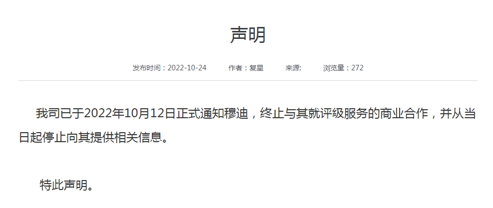 中新经纬10月24日电 复星国际有限公司官网24日声明,已于2022年10月12日正式关照穆迪,克制与其就评级服务的贸易相助,并从当日起克制向其提供干系信息。 截图泉源:复星官网 Wind数据表现,9月30日,穆迪发布陈诉称,将复星国际有限公司B1的公司家属评级列入下调观察名单。别的,穆迪还将FortuneStar(BVI)Limited发行,并由复星提供无条件及不可取消包管的有支持高级无抵押债券的B1评级列入下调观察名单。同时,穆迪将评级猜测从负面调解为评级观察。 此前,8月23日穆迪陈诉称,将复星国际有限公司的企业家属评级由“Ba3”下调至“B1”,猜测由“评级观察”调解为“负面”。别的,穆迪已将Fortune Star (BVI) Limited所发行债券的高级无抵押债务评级由“Ba3”下调至“B1”。 6月14日,穆迪公告称,将复星国际有限公司(Fosun International Limited)“Ba3”企业家属评级列入负面观察名单,同时将Fosun Star (BVI) Limited发行债券的“Ba3”受支持高级无抵押评级列入负面观察名单。(中新经纬APP) |