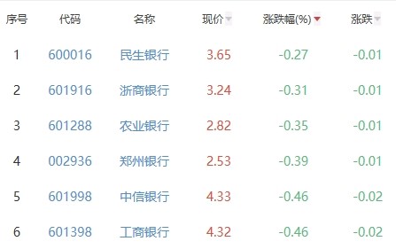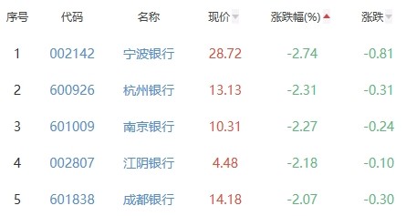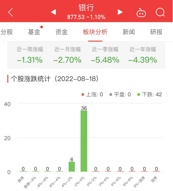 中国经济网北京8月18日讯 本日,银行板块团体跌幅1.10%,此中0只股票上涨,0只股票平盘,42只股票下跌。 数据表现,停止本日,银行板块近一周涨幅-1.31%,近一月涨幅-2.70%,近一季涨幅-5.48%。 此中,民生银行、浙商银行、农业银行、郑州银行、中信银行、工商银行位列板块涨幅前五位,涨幅分别为-0.27%、-0.31%、-0.35%、-0.39%、-0.46%、-0.46%。 宁波银行、杭州银行、南京银行、江阴银行、成都银行位列涨幅榜后五位,涨幅分别为-2.74%、-2.31%、-2.27%、-2.18%、-2.07%。 |