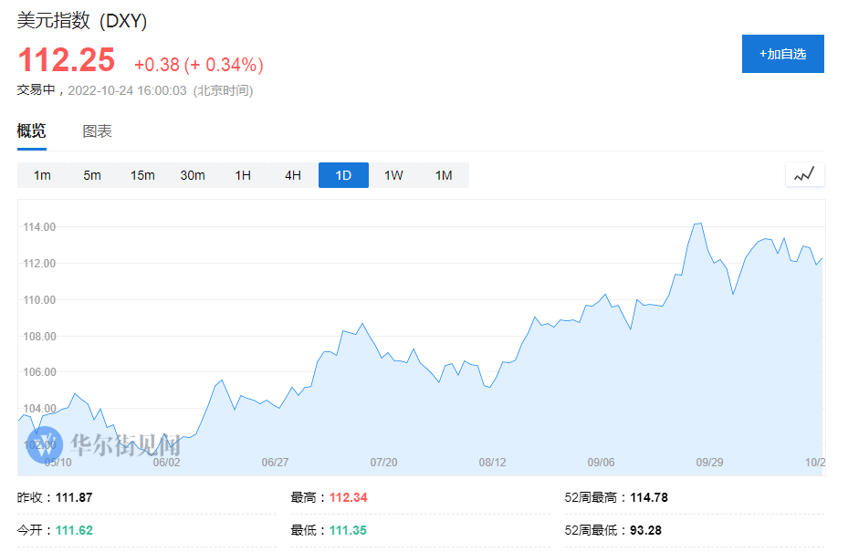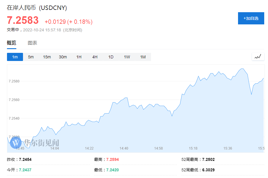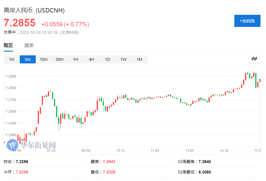 10月24日,离岸人民币兑美元跌至7.29,随后跌幅有所收窄。 反应国际投资者预期的离岸人民币兑美元日内一度跌622点至7.2922,较前日下跌约0.83%,并高出前日盘中最低点。 在岸人民币兑美元日内一度跌344点,至7.2588。 10月24日,美元指数盘中最高112.34点,较前一日上涨约0.39%。 欧盟统计局10月24日发布数据表现,欧元区10月制造业PMI初值 46.6,预期 47.9,前值 48.4;服务业PMI初值 48.2,预期 48.2,前值 48.8。 |