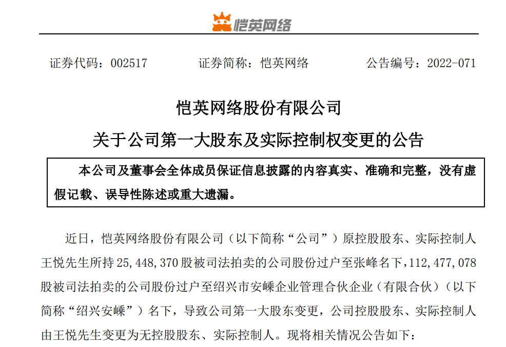 本文泉源:期间财经 作者:刘子琪 如果你没听说过恺英网络(002517.SZ),那你肯定听说过这家公司旗下的游戏《贪玩蓝月》。 “各人好,我是渣渣辉”,这句出自该游戏的经典广告词,曾风靡一时。 克日,这家互联网游戏公司又有了新消息——其第一大股东及现实控制权将变更。 恺英网络公告称,因公司原控股股东、现实控制人王悦所持部门股份被实行司法裁定,导致公司第一大股东变更。现在公司处于“无主”状态。 10月24日上午,恺英网络干系负责人复兴期间财经称,本次权益变更不会导致公司业务的谋划出现巨大厘革,也不存在陵犯公司及中小股东优点的情况。 图片泉源:恺英网络官网 天使投资人、着名互联网专家郭涛克日在担当期间财经采访时体现,短期来看,现在暂无第一大股东、现实控制人的情况,不会对恺英网络谋划管理造成巨大影响,但长期来看,谋划管理分歧则会影响公司谋划、决议服从等,倒霉于公司康健发展。 二级市场方面,恺英网络本年8月股价迎来一波涨势,从8月2日最低5.8元涨到9月7日的8.48元,区间最大涨幅为46.2%。而王悦所持股份被司法拍卖的时间为9月6日至9月7日。拍卖竣事后,恺英网络的股价一起下滑,制止10月24日收报6.11元,当日跌幅3.02%,至9月7日最高点跌幅达27.95%。 控股股东消散 10月20日晚间,恺英网络披露《关于公司第一大股东及现实控制权变更的公告》称,公司原控股股东、现实控制人王悦所持2544.84万股被司法拍卖的公司股份过户至张峰名下,1.12亿股被司法拍卖的公司股份过户至绍兴市安嵊企业管理合资企业(有限合资)(下称“绍兴安嵊”)名下,恺英网络变更为无控股股东、无现实控制人。 截图泉源:恺英网络公告 据公告,本次权益变更后,王悦持有的股份占恺英网络总股本比例由此前的14.38%降落至7.97%,不再是公司第一大股东;原第二大股东金锋,现任公司董事长,持有公司股数占公司总股本的13.78%,被动成为公司第一大股东。 据悉,此次王悦所持股份占比降落,源自此前其与兴证证券资产管理有限公司质押式证券回购纠纷案件。 据上述公告,此次股份变更后,恺英网络前三大股东分别为天然人金锋、王悦,及香港中心结算有限公司,持股比例分别为13.78%、7.97%、9.08%。而绍兴安嵊、张峰分别持有恺英网络总股本的5.23%、1.18%。 恺英网络同时体现,本次权益变更不会对公司一样寻常谋划运动产生倒霉影响,不会影响公司在业务、资产、机构、职员、财务等方面的独立性;别的,公司具有规范的法人管理布局及独立谋划的本领,本次权益变更不会导致公司业务的谋划出现巨大厘革,也不存在陵犯公司及中小股东优点的情况。 值得关注的是,绍兴安嵊背后的股东之一正是恺英网络董事长金锋,其持有绍兴安嵊49%的股份;另一大股东是名为金海波的天然人,持股比例51%,为绍兴安嵊的现实控制人。 对此,上述恺英网络干系负责人称,现在没有听说金锋与绍兴安嵊是否会结成同等办法人消息,临时不构成关系。 究竟上,自2019年3月王悦失联后,金锋不停在扩大对恺英网络的持股比例。 2020年5月29日至2021年9月6日期间,金锋通过会合竞价、大宗买卖业务等买卖业务方式,增持恺英网络股份1.05亿股,占据表决权股份(剔除公司回购股数)的4.99%。 本年以来,由于王悦所持恺英网络股份多次举行司法拍卖,金锋也踊跃加入,两次竞拍王悦手中股份,分别在5月31日、9月15日通过司法拍卖增持2124万股、6480万股。 别的,10月21日,恺英网络还公布了王悦所持股份第二次被拍卖的公告。 公告表现,10月18日至10月19日,王悦所持恺英网络1.14亿股由天然人张宇、王杰分别竞得6250万股、5137万股。若本次拍卖股份顺遂完成过户手续,王悦持股数将变为5767.69万股,仅占公司总股本的2.68%。 上述恺英网络干系负责人对期间财经回应称,“现在还不确定二次拍卖可否准期过户,市场上存在由于某些缘故原由没有过户乐成的大概性。别的,拍卖属于个人资产竞拍,由债权人、法院共同探究,颠末干系法规,以公开竞价将所持股份转让出去。” 至于王悦所持股数还会不会拍卖、何时拍卖,该负责人体现“暂不知情”。 总之,恺英网络属于王悦的“期间”真的要告一段落了。 成也传奇,败也传奇 就在本年9月末,恺英网络与传奇IP长达四年的商事纠纷案也终于落幕。 9月23日,上海高院二审判断上海恺英对浙江欢游的债务负担连带清偿责任。恺英网络方面体现,公司现在资金充裕,但预计本次讯断金额将相应淘汰公司2022年归母净利润。 别的,恺英网络还称:“本案上诉人比年来通过恶意举报、恶意诉讼、恶意保全等方式,试图向公司施压以到达其贸易目标,公司不停未屈服。上海恺英将采取包罗但不限于申请再审、抗诉、制止互助等正当合规方式切实维护自身及广大投资者的正当权益,与恶意诉讼果断抗争到底。” 这场业内瞩目标天价IP纠纷已耗时7年之久。 2016年,恺英网络与《传奇》版权全部者之一的韩国游戏公司娱美德签署了IP授权条约,随后睁开了对于一系列传奇类游戏公司的收购,包罗《贪玩蓝月》开辟商浙江盛和、《传奇来了》开辟商浙江九翎。 然而,恺英网络与娱美德签署协议时并未征得《传奇》版权的另一全部方亚拓士同意,后者一怒之下以侵权为由将恺英网络和娱美德告上法庭。 大概是不想将变乱闹大,恺英网络终极选择与亚拓士息争并携手睁开互助,但这又引起了娱美德