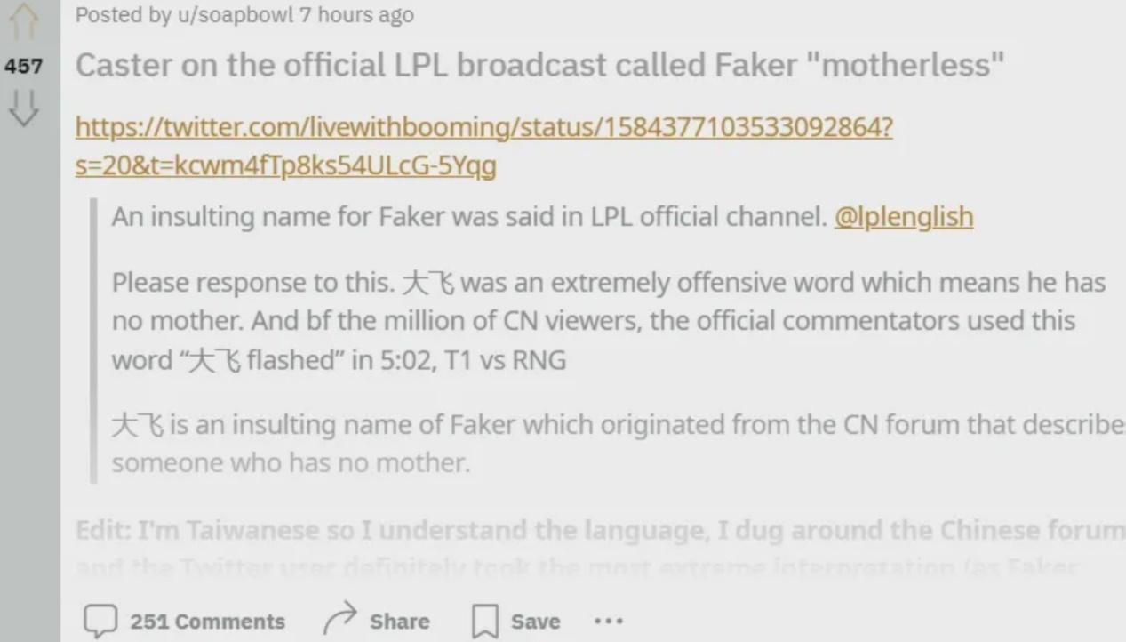 各位LPL的观众和豪杰同盟召唤师各人好,这里是天卑鄙戏汇。 S12举世总决赛四场镌汰赛的角逐都竣事了,对于LPL来说效果是没有到达预期,只有一支LPL队伍进入四强,环境与客岁一样,想要夺冠就得靠JDG一支战队了,但反面的形势看起来并不太妙,由于T1如今的状态非常火热。 在这个过程中,S12场外是发作了一波不小的节奏,是和LPL讲授相干的。 讲授米勒,引发外网热议众所周知Faker选手在本年MSI竣事之后,得到了一个新的称呼,叫做“大飞”,由于Faker在MSI采访上的一些言论,被观众质疑为是输不起的嘴硬举动,比如说第五局状态不好,应该吃香蕉,另有输给RNG后表现RNG的选手没有给他留下什么深刻的印象等等。 之后很多LPL论坛这边观众都称Faker为大飞,大概在反面加上老师两个字。 而镌汰赛阶段RNG与T1的角逐中,娃娃米勒的讲授是引起了比力大的争议,有观众指出,米勒在讲授角逐的过程中说了Faker的黑称“大飞”。 这个变乱很快是在外网也引起了不小的热议,一开始有韩网观众以为大飞是一个好的称呼,厥后发现不是,如今很多外网的观众都以为米勒应该致歉,作为官方讲授,不应该在讲授台上说选手的黑称。 多方澄清,米勒没有不恭敬Faker这个变乱的节奏很快就发酵起来了,一开始是很多国内的观众小范围地举行讨论,喷米勒说他不恭敬Faker了,然后责备谴责米勒娃娃说他们讲授角逐也不客观,RNG劣势的环境下还经典不亏,可以继承,能打,另有就是第一局上风的时间说了一句纸老虎。 这个变乱开始阶段之以是说米勒称Faker为大飞的节奏能起来,重要缘故因由是在T1击败RNG之后,各大论坛迎来了一波Faker粉丝以及和RNG有仇的粉丝群体对RNG的一波力度非常大的整理。 由于出现了大范围整理的征象,很多国内的Fake和LCK粉丝也会开始攻击讲授,同时拿出很多选手的赛后采访,表现他们也有嘴硬举动,MSI期间,Faker被称之为嘴硬,是被断章取义了。 但这个变乱很快就迎来了反转,在那波大规模整理事后,有观众关注到这个变乱而且要求以为米勒称Faker大飞的观众指出时间节点,而且举行重新复盘后发现米勒并没有说大飞,节奏闹大之后,米勒的老婆出头举行了回应,同时LPL官方推特以及T1的COE也了局举行了澄清,表现娃娃米勒讲授T1的时间并未使用不妥词汇。 讲授被听错,不是第一次了值得一提的是,这已经不是第一次米勒被观众听错了,之前讲授SMLZ角逐的时间,被观众听成了米勒在场上说脏话WC,另有之前讲授雨童曾经说过小虎打疯了,效果却被网友记成为杀疯了。 米勒这一次被听错的讲授片断,之以是会被听错,是由于米勒在谁人时间节点说了一句小虎没闪现了,而娃娃说了一句“打出一个闪现可以了”,两个讲授先后说了这句话,然后娃娃这句话内里说的“打”这个字,和米勒说的这个“没”字连在一起了,听起来像是大飞。 这里如果不举行慢放的话,直接听,简直有大概听错成是大飞,一开始听错的观众,发起可以单独听每一个讲授的讲授词,如许就能分辨出来了。 想要听的观众可以看一下RNG与T1角逐,在4分55秒到5分多种这个时间节点两个讲授的讲授词。 而这个变乱的关键点在于,很多粉丝大概说观众是跟风喷米勒的,纵然有很多观众是看了角逐,对米勒说大飞的这个变乱没什么印象,但看到很多人说也如许以为了。 这就导致变乱被澄清之后,Faker粉丝反而在顺风的时间遭到了一波整理,不得不说论坛回合制也确实是故意思。 |