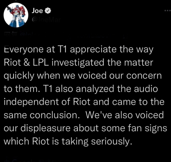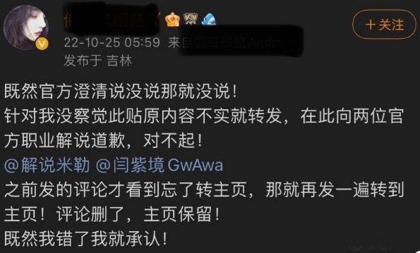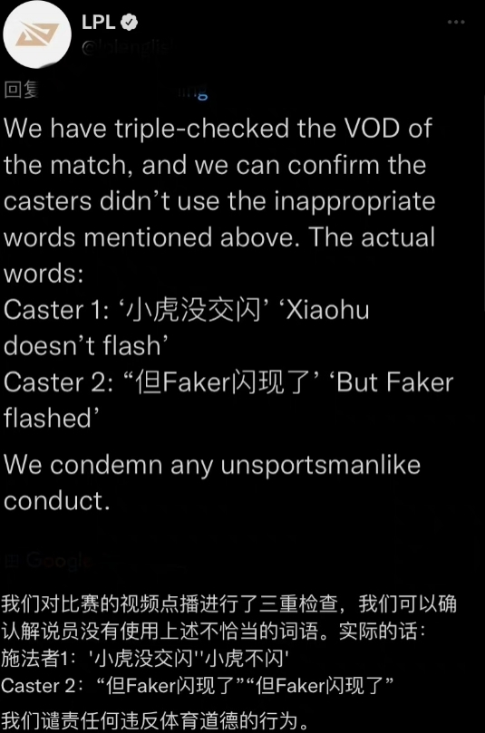 克日,有粉丝在交际平台发文,称自己在由米勒和WaWa讲授的环球总决赛八强RNG vs T1的比赛中,有听到讲授米勒在游戏过程中提及“大飞”一词,以后干系舆论敏捷发酵, 引起了各人的热议。 随后,LPL官推敏捷出头澄清,发出了粉丝所指变乱的原视频,并表现我们对于这段视频颠末再三确认,可以确定讲授米勒并没有提及“大飞”这个词。究竟上两位讲授的原话如下: LPL官推发文澄清: 讲授1:小虎没交闪 讲授2:但Faker闪现了。 我们非难任何违背体育道德的举动 T1的CEO joe marsh则在下面复兴: T1的每个人都很感谢拳头官方和LPL,在我们表达了对此事的担心后敏捷处置惩罚此事的态度。T1自己也构造了人分析这段音频并得出了和拳头官方雷同的结论。对于拳头官方认真处置惩罚一些粉丝举动我们也表达了自己的难过之情。 在官推澄清后,不明本相的粉丝也在交际平台发文致歉: (泉源:网络资讯) |