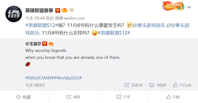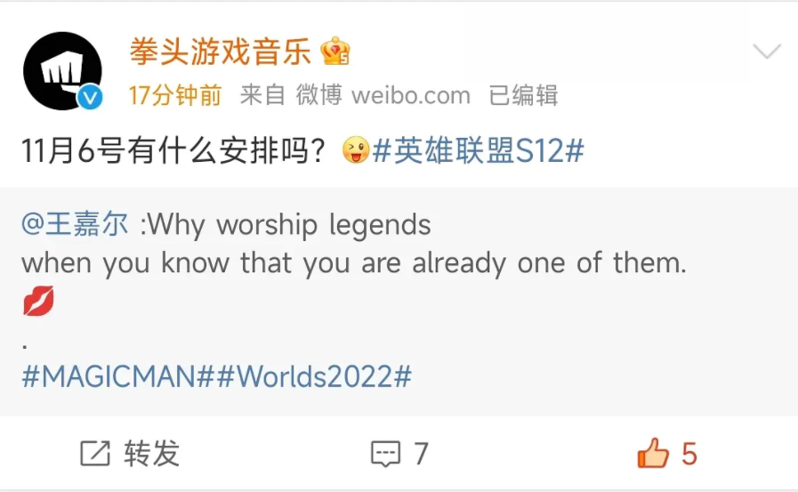 S12天下赛还剩下3场BO5,分别是4强赛的2场半决赛,以及末了的S12总决赛了。而每年天下赛总决赛的时间,现场的高朋和体现都会备受等候。迩来LOL官方疑似在微博上暗示了本年S12天下赛的演出高朋,好像是王嘉尔。 消息泉源如下,拳头游戏音乐忽然在微博上转发了王嘉尔的个人微博,而且扣问他:11月6号有什么安排吗?而且带上了豪杰同盟S12的标签。刚好11月6号是S12天下赛的总决赛,于是引发了很多的推测。 随后豪杰同盟赛事官方也转发了拳头游戏音乐的这条微博,而且继续给出暗示:是11月6号有什么事变要发生吗? 于是很多人推测王嘉尔极大大概要继承S12天下赛总决赛的演出高朋,这让很多粉丝们狂喜,纷纷鼓掌喝彩。不少人都体现这不是暗示,简直是官宣,另有人推测是不是要有联动,更有粉丝直接扣问:不如透露一下演出情势和选曲吧! 刚好王嘉尔去美国了,时间和地点都对得上,而且王嘉尔在前不久也偷了下周会有活动,但是他没有提前透露,只是告知粉丝们下周就会知道了。而豪杰同盟S12天下赛的赛事,是环球瞩目标电比赛事,影响力非同一样寻常,王嘉尔如果真的是演出高朋,确实是一件会让很多人高兴的事。 没多久后王嘉尔本人就在推特上透露:当你是传说中的一员时,为什么还要崇敬传说?其时王嘉尔就带上了2022天下赛的标签。而LOL官方推特也回应:11月5日(美国时间)你要做什么? 那么王嘉尔来当决赛演出高朋这件事变,应该是八九不离十了。请了中国艺人当决赛高朋,确实很有排面,而且王嘉尔也在韩国发展过,在外洋有肯定的着名度,以是两边的观众应该都对他比力熟悉。固然也有人担心固然请了王嘉尔,但是万一总决赛是两支LCK战队的对决,是不是就尴尬了。别的也有人体现不如请KDA来唱,让KDA回归演出会不会更好? 那么,对于这件事变,你们有什么想说的吗?你们等候在S12总决赛上看到王嘉尔吗? |