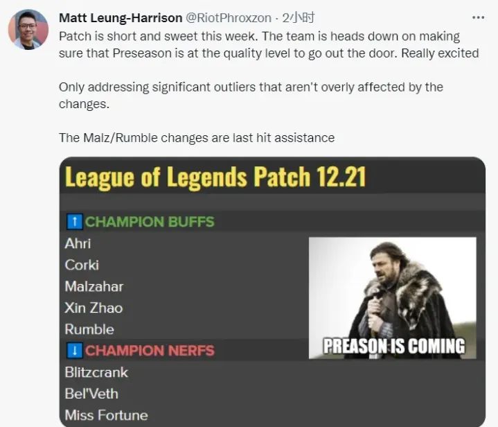 全村人末了的盼望 JDG!加油! THE ONE&ONLY选手记录片:JackeyLove篇 DK vs GEN成S12开赛至今最受接待角逐 克日数据网站Esports Charts分享S12观赛数据,DK与GEN的BO5成为了S12开赛至今最受接待的角逐,观众峰值高达165w!(本次统计不外包罗国内数据) Doinb透露天下赛观看人数:韩国本年只有客岁60% 2022好汉同盟讲授主持杯预热景象剧:将于11月12日开饭 好汉同盟赛事官博发布2022好汉同盟讲授主持杯预热景象剧——吾胃竞顶峰,吃至无双!将于11月12日17:00正式放饭。 无缝衔接天下赛,角逐一次看个够!人多口杂向您报告实时资讯:特邀秘密职业选手入座讲授席,职业讲授打角逐,职业选手来讲授,讲授效果绝对给力;镌汰赛举行地直接坐落虹桥赛事中央,虹桥站卖票,讲授杯不卖票;新人来势汹汹,先辈们可要多加留意,这场角逐可没有情面调皮哦~ Oner:Kanavi是现在最强的选手之一 我们会以3比1降服JDG Q:你将和JDG.Kanavi选手比武,感想怎样呢?你推测半决赛的比分会是多少呢? Oner:我以为Kanavi选手是现在最强的选手之一,这也是我最等待的一场角逐,固然现在无法容易推测效果,如果我们降服JDG,应该会以3比1取胜。 Q:你以为半决赛什么位置比力关键呢? Oner:我以为上野比力告急,JDG上野经常取得上风。 Q:相比于客岁,本年你在哪些部门有所进步呢? Oner:和客岁相比,我没有那么告急了。客岁我没有那么从容,本次天下赛队友们都信赖我,我也信赖队友们,以是才变得更加游刃有余了,这部门影响很大。 Q:跟好汉同盟汗青最佳Faker选手同队一起共同,你感受怎样呢? Oner:最开始我有很多想法,由于Faker选手对我来说也是传怪杰物,我非常告急,也没怎么能跟他语言。但如果不绝维持如许的状态,角逐不会顺遂,我以为我也没有打职业的资格,以是我积极跟他说半语,相赫哥也继承了我积极的效果。现在我们就很自然地说半语,就是以密切的兄弟关系在打角逐,以是齐备才很顺遂。 C9发推:这绝对是万圣节最可骇的装扮——悠米套装 C9官方推特更新,发布一张图片,而且配文:这绝对是万圣节最可骇的装扮——悠米套装! imp:LPL锻练和粉丝有标题,隔壁赛区粉丝是直接用卡车表达不满的 前职业选手imp开播时,有弹幕品评LPL锻练,而且拿T1锻练Bengi作比力。imp以为LPL锻练真的有标题,而且体现隔壁赛区粉丝是直接用卡车表达不满的。 imp:额……LPL锻练真的有点标题。LPL锻练真的有标题。知道吗,LC**丝是叫个车,放在他们基地前面。锻练堕落了,就“西八滚吧”如许子写着。感觉LPL粉丝多点积极吧。(imp提及的就是LCK那边的卡车变乱) Rookie:一个LPL打三个LCK标题不大,LCK确实比从前强很多 Rookie在直播中体现LCK本年确实比从前强很多,以为T1不如GEN。30号JDG打T1,压力来到JDG这边,JDG我以为没啥标题吧,实在我以为也不是在说别人欠好,并不以为T1有GEN那帮人强就是整个队,固然如许说不太好,但是RNG打T1好几场都是RNG上风很大,以是说盼望JDG加油,现在一个LPL打三个LCK我以为标题不大,本年的LCK确实比从前强很多。 PSG更推:请不要再出现导致游戏瓦解的bug在半决赛了 PSG官方推特更新,发布一张图片,配文:我发誓这是我末了一次讥讽拳头的bug,请不要再出现导致游戏瓦解的bug在半决赛了.... 图:拳头修复游戏bug&拳头筹谋皮肤和时间通行证 英文讲授:RNG分别作为1-4号种子在S赛的八进四镌汰赛中落第 2022好汉同盟举世总决赛正在举行,本日英文流讲授分享冷知识。停止现在,RNG分别作为1-4号种子在S赛的八进四镌汰赛中落第。 1号种子-2018 2号种子-2016 3号种子-2021 4号种子-2022 2022.10.23本年生日又是在赛场过的。本年好像又有 2022.10.23 本年生日又是在赛场过的。本年好像又有了些差别。 去赛场的路上,特意挑了一个提拉米苏蛋糕带去准备给deft,本年生日相比客岁在冰岛应该热闹了很多,想着在角逐开始之前给他,到了赛场恰好他们也到了,于是我慌张皇张跑去配景写了一张贺卡。给他送了已往,对他说:“生日快乐”,他一如既 DK官推分享机场图:安全抵达~到韩国啦! 在S12镌汰赛第三日的角逐中,DK 2-3不敌GEN,止步八强。本日DK官推分享一张选手们在机场的合照,配文:安全抵达韩国~ 12.21版本改动前瞻:兰博飞机加强 卑尔维斯终遭削弱 随着赛季的连续举行,新的版本也将随之到来。本日召唤师峡谷团队的首席筹划师Riot Phroxzon公布了12.21版本改动前瞻。以下为推特内容大意: Riot Phroxzon:“下次的版本变更会非常短小,但是甜蜜。均衡团队如许做的缘故起因是为了让季前赛的内容保质保量。非常的令人高兴。 我们这个版本只修改没有被其他改动影响的显着非常值。 玛尔扎哈/兰博的改动是为了资助补兵。 好汉加强:阿狸,飞机,玛尔扎哈,赵信,兰博; 好汉削弱:呆板人,卑尔维斯,厄运小姐。 DRX.Deft:我已经不记得上一次这么开心地过生日是什么时间了 在昨日的S12举世总决赛镌汰赛上,DRX乐成让二追三击败EDG,赛后LCK官方放出配景采访,以下为内容节选。 Q:晋级四强感想怎样呢? Deft:晋级四强,非常开心。本日队友们都打得非常好,很感谢他们。我已经不记得上一次这么开心地过生日是什么时间了。本日真的太棒了。粉丝们还为我唱生日歌、支持我们战队,非常感谢各人。 Q:刚才你在舞台采访时,(观众们不是喊)Let’s dance吗?你能显现一下吗? Deft:(笑)(逃跑)我要走了。 Q:晋级四强感想怎样呢? Pyosik:比起晋级四强,让二追三乐成得到角逐的胜利,让我非常开心。最开始我