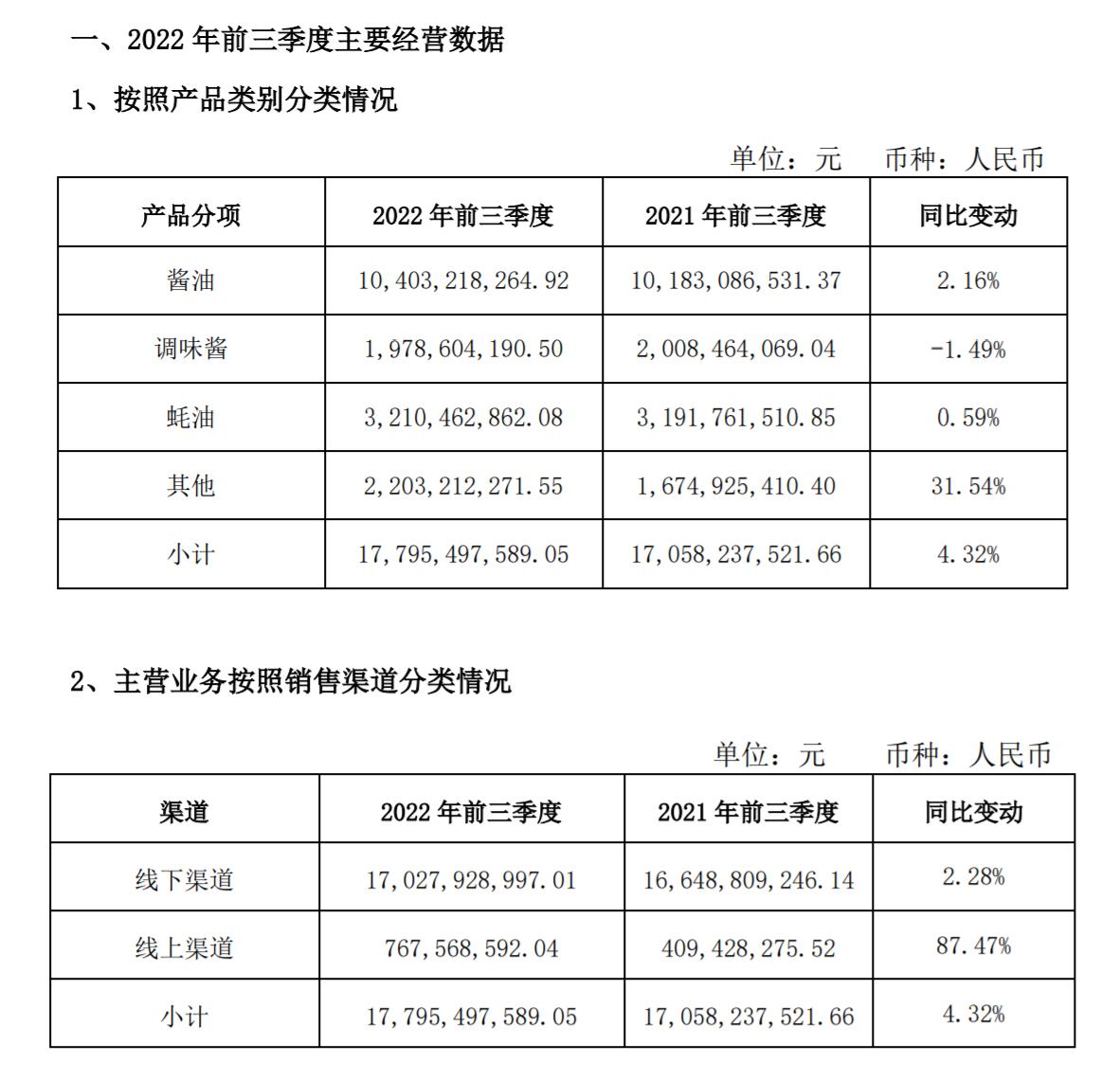 中新经纬10月26日电 “酱油茅”三季度业绩正式公布。 26日盘后,海天味业披露2022年第三季度陈诉表现,单季实现业务收入55.62亿元,同比下滑1.77%;归母净利润12.74亿元,同比下滑5.99%;根本每股收益0.27元。 前三季度,海天味业累计实现业务收入190.94亿元,同比增长6.11%;归母净利润46.67亿元,同比下滑0.86%;根本每股收益1.01元。 泉源:海天味业第三季度陈诉 当天,海天味业还公布谋划数据表现,前三季度酱油收入104.03亿元,增长2.16%;调味酱收入19.79亿元,同比下滑1.49%;蚝油收入32.10亿元,同比增长0.59%。 按渠道分类,期内海天味业线下渠道实现收入170.28亿元,同比增长2.28%;线上渠道实现收入增长87.47%至7.68亿元。 泉源:海天味业谋划数据 制止三季度末,海天味业股东户数为165164户,较上季度末(6月30日)降落18612户,降幅为10.13%;户均持股市值232.36万元,较上季度末增长4.52万元。 前10名股东持股环境方面,国家队中国证券金融股份有限公司现身前十大流通股东,持股数量为378.33万股,较上季度持股数量稳定,持股比例为0.94%。 Wind数据表现,国家队已连续29个季度持有海天味业股份,此中5个季度增持,9个季度减持,15个季度持股稳定。 泉源:海天味业第三季度陈诉 别的,三大股东持股数量变更,香港中央结算有限公司(陆股通)持股数量增长,增持后持股数量为30767.97万股;黎旭晖、赖建平持股数量降落,减持后持股数量分别为7577.50万股、3781.27万股。 二级市场上,制止10月26日收盘,海天味业跌1.84%,报价67.87元,总市值3145亿元。(中新经纬APP) |