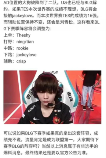 在说冬转消息之前先说一下Uzi,耐克正式公布与中国电竞活动员Uzi签约,这是耐克各人庭第一次在天下范围内签约的电竞选手,这波Uzi算是赚麻了,牌面不减当年,固然耐克之前由于新疆棉变乱受到打击,不外他们的力气仍旧很雄厚,自从和BLG解约之后Uzi的古迹也算是如日方升,这波签约耐克也有暗示来岁复出的意思,假如Uzi不复出打角逐,那他充其量就是一个人气高点的主播,签约就没那么告急了,以是来岁可以等候一手UZI回归。 说完Uzi再来看一下BLG战队,有网友爆料了他们来岁转会期的动向,上中野三人是各人最认识的小IG成员,不外打野另有一个替补人选就是小天,由于本年TES天下赛结果不佳,以是很多俱乐部都对他们虎视眈眈,此中BLG就比力喜好阿水,想在上中野确定之后签下阿水,这波一旦乐成那小IG就属于秽土转生了,至于左手就算了吧,假如说S12赛季没开始之前BLG确实特别想买左手,但S12天下赛竣事之后左手大赛软脚虾之名已经名满江湖了,买他纯粹是自讨苦吃,与其如许Rookie这种性价比特别高的选手就成为首选。 大概有观众会质疑WBG战队和V5战队不会放人,对此完全不消担心,由于这两个人的合约都是本年到期,而且他们不会像Uzi那样受经纪约限定,其次Theshy想和Rookie捆绑不是一天两天了,本年之以是分开美满是被逼的,至于宁王也在直播中明确表现复出的话想和老队友一起,AD位置Doggo则是被下放到了二队,昔日备受各人关注的Uzi和大狗都鸣金收兵了,真是一种讽刺啊,不知道阿水会不会为了焦点位置选择继承留在TES。 总结一下网友爆料的BLG转会消息,他们有这个想法完全可以继承,究竟BLG的特点就是流量大于结果,这四个人要是能买来的话不管胜负都不缺人气,昔日小IG的粉丝完全可以收编过来,说句真话这四个人加一起完全不逊色于UZI的流量,到时间输了的话就更故意思了,输一把上演一场分锅大会,到时间锻练要多加警惕了,给他们提个发起,除了红米大概扣马外真没人能管得住这几个选手。 说完BOLG转会一事再来看一下小明,外网作者在统计伤害的时间发现小明泰坦21分钟之前一点伤害没打,在T1对战RNG第一场角逐中小明第一次造成伤害的时间是21分06秒,理论上来说除了做视野之外前20分钟小明一点现实作用没有,满是威慑资助Gala吃线,就如许还说他硬辅玩得好,真是醉了,假如T1第一场角逐打得再好点,说不定443就要被代替了,以后不能再叫小明白,要改成大明白,泰坦20分钟零伤害真的是革新了各人对这个好汉的认知。 |