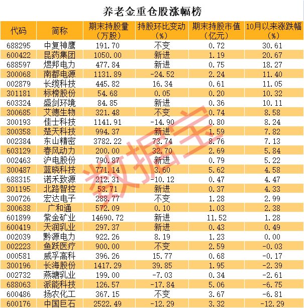 作者:数据宝 陈见南 养老金重仓股10月走势远强于大盘。 随着上市公司三季报徐徐披露,根本养老保险基金的重仓股也随之展露。 证券时报数据宝统计,养老金二级市场上连续落子布局,三季度末共现身28股的前十大流畅股东名单,此中新进8股,增持9股,合计持股量达3.44亿股,期末持股市值合计61.04亿元。 以板块分布统计,养老金账户持有个股中主板有14股、科创板有4股、创业板有10股。按行业统计,养老金账户持股紧张会集在医药生物、电力装备行业,分别有5股、4股上榜。 三季度末,养老金账户持有紫金矿业数量最多,根本养老保险基金八零四组合为公司第十大流畅股东,持股量为1.47亿股;其次是东山精密,根本养老保险基金一五零二二组合、根本养老保险基金一二零四组合为公司第七、第十大流畅股东,合计持股量为3782.22万股。从期末持股市值看,养老金账户期末持股市值在1亿元以上的有15股,分别是紫金矿业、东山精密、蓝晓科技等。 持股比例方面,养老金账户持股比例最多的是长海股份,三季度末根本养老保险基金一六零三一组合、根本养老保险基金一六零三二组合分别为公司第三、第八大流畅股东,合计持股量为1417.29万股,占流畅股比例5.76%。养老金持股比例居前的另有煜邦电力、蓝晓科技等,持股比例分别为3.96%、3.88%。 巨资抄底矿业巨头 养老金和社保基金均由天下社保基金理事会负责运作。数据宝对养老金账户持有股票统计发现,养老金重仓股中13股的前十大流畅股东榜也有社保基金现身。 此中,养老金账户持有14690.72万股的紫金矿业,前十大流畅股东中就有2家社保基金现身。紫金矿业为根本养老保险基金八零四组合三季度新进重仓股。从走势来看,矿业巨头近期股价有所走弱,养老金或低位抄底。三季报体现,紫金矿业实现净利润167亿元,同比增长超47%。 从持偶然间来看,养老金账户持股限期最长的是威孚高科,养老金账户已一连11个陈诉期出现在公司前十大流畅股东名单中,最新持有396.26万股,较上个季度环比增长15.77%。别的,养老金账户已一连持有东山精密、中国巨石等股至少两个陈诉期。 业绩方面,养老金账户现身个股中,三季报净利润实现增长的有6家,净利润增幅最高的是煜邦电力,公司实现净利润5761.56万元,同比增长1508.87%。 养老金押中储能大牛股 9月16日,社保基金会公布了根本养老保险基金受托运营年度陈诉(2021年度)。根据年报,2021年末受托根本养老保险基金权益总额高出1.46万亿元,受托以来每年都安稳实现正收益,一连多年降服投资基准,累计投资收益额2619.77亿元,年化投资收益率约6.49%。 10月以来,养老金重仓股广泛跑赢大市,26股均匀涨幅达5.17%。具体看,中复神鹰大涨逾30%居首,昆药团体涨逾20%,煜邦电力、南都电源、长缆科技等多股涨逾10%。 从整年体现来看,养老金押中了多只大牛股。此中,派能科技年内大涨近90%。该股为养老金二季度新进重仓股。别的,南都电源、中复神鹰、昆药团体等个股年内均大涨逾20%。派能科技、南都电源、中复神鹰均为养老金二季度新进重仓股。 声明:数据宝全部资讯内容不构成投资发起,股市有风险,投资需审慎。 |