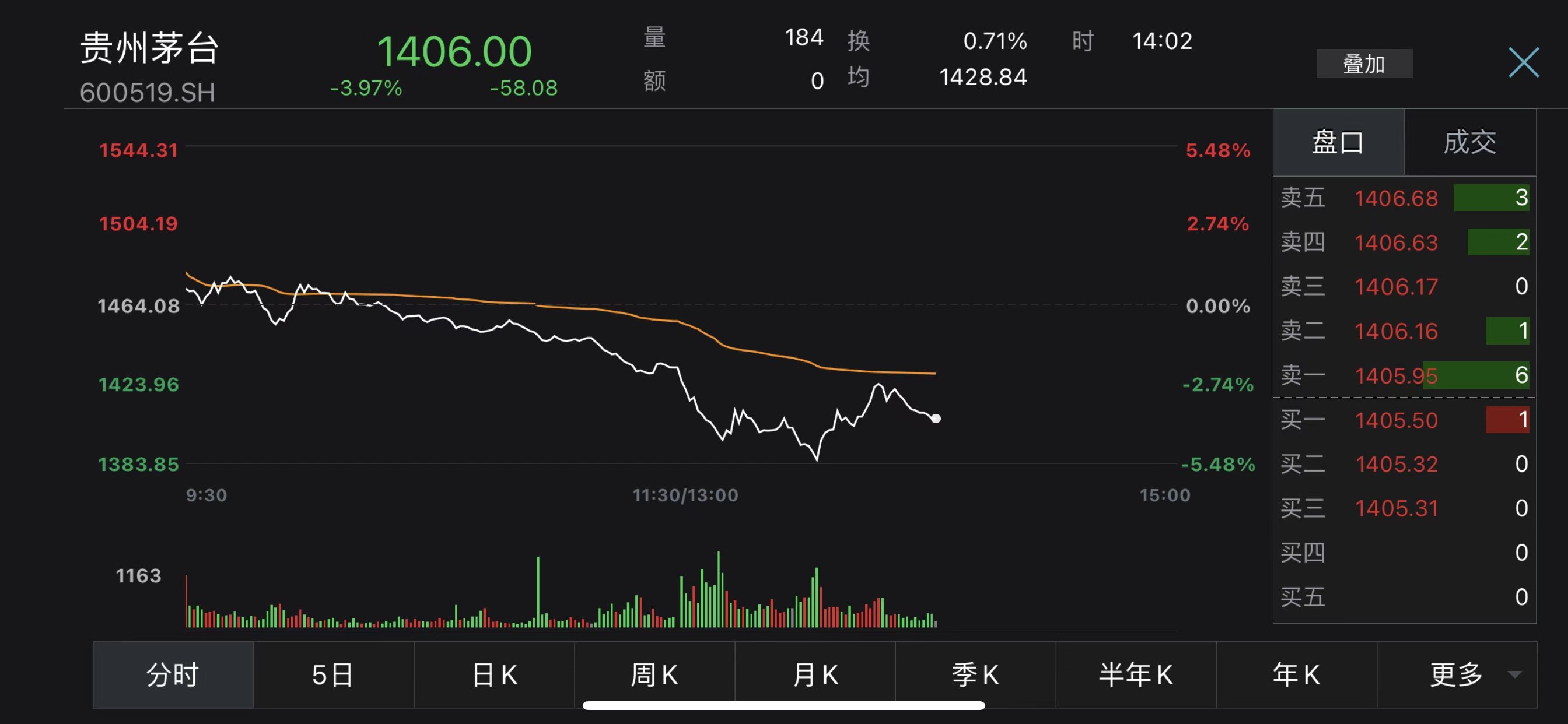 中新经纬10月27日电 27日午后,贵州茅台股价跌破1400元关口,创2022年6月尾以来新低。 Wind数据表现,10月27日贵州茅台股价高开低走,午后两度跌破1400元。制止发稿,贵州茅台跌2.87%报1422.00元。2022年10月10日(10月首个生意业务日)以来,贵州茅台股价一连走低,制止10月26日13个生意业务日累计跌幅达21.81%,蒸发5129.76亿市值。 10月17日,贵州茅台发布《2022年第三季度陈诉》表现,前三季度实现业务收入871.60亿元,同比增长16.77%;归属于上市公司股东的净利润444亿元,同比增长19.14%。 三季报还表现,制止2022年9月末,贵州茅台平常股股东总数为14.52万户。 中新经纬留意到,贵州茅台股价一连下跌引发网友热议。有网友表现,“神话幻灭”“被套了”;另有网友扣问,“能抄底吗?”“置之死地而后生?”(中新经纬APP) |